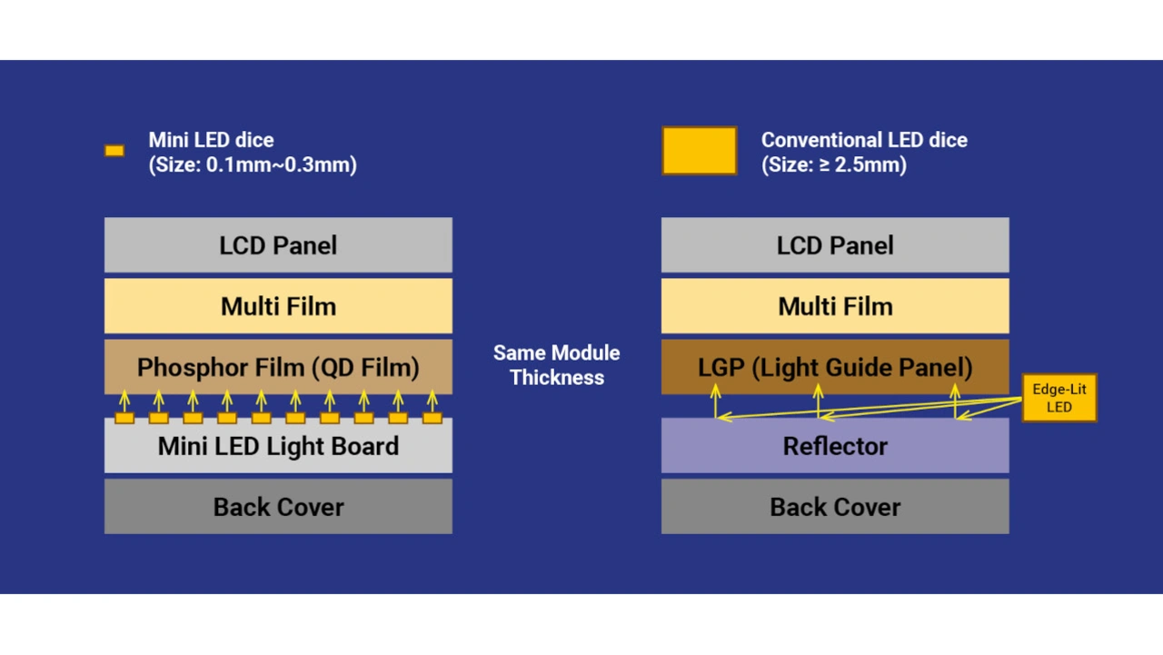 Die Bezeichnung Mini-LED steht für eine neue Art der Hinterleuchtung von TFT-LC-Displays, bei der anstelle einer Lichtquelle für die Hinterleuchtung viele kleine LED-Chips dicht über die Hinterleuchtungsplatine verteilt sind. Jeder einzelne LED-Chip unterstützt lokales Dimmen, wodurch ein höherer Kontrast, eine höhere Helligkeit und ein breiterer Farbumfang bei gleichzeitig geringerer Stromaufnahme erreicht werden (Bilder 1 und 2).