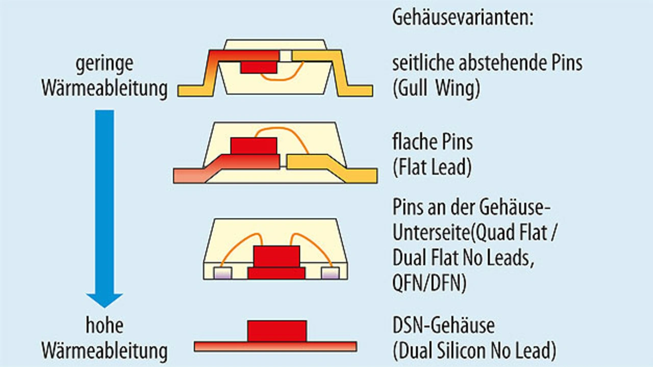 Der schrittweise Übergang von Quad-Flat-No-Lead-Gehäusen (QFN) zu diskreten Flat-No-Lead-Gehäusen (DFN) und dann zu verschiedenen dualen Silizium-No-Lead- (DSN-)Gehäuseformen führte zu einer deutlich höheren Wärmeableitung der Gehäuse. In dieser Hinsicht bieten aktuell die DSN-Gehäuse eine sehr hohe Effizienz, die durch einen deutlich verkürzten Wärmepfad zwischen dem Chip und der Leiterplatte und durch den Wegfall des Rahmens (Lead Frame) erreicht wird.