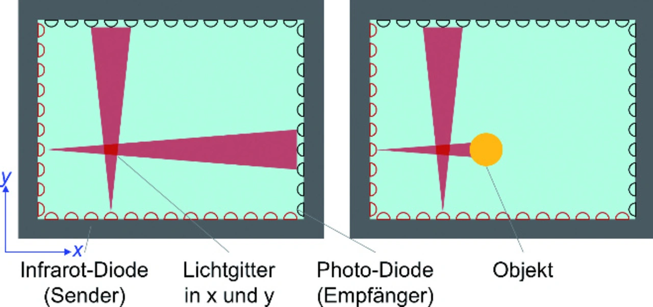 Das Prinzip der Infrarot-Technik ist simpel: in x- und y-Richtung des Bildschirms wird ein Lichtgitter aufgespannt. Wird dieses unterbrochen, lässt sich jeder eindringende Gegenstand detektieren und dessen Position auswerten. Diese Technik ist einfach und robust, und sie hat den Vorteil, vom Display getrennt zu sein. Verwendet wird sie dort, wo Displays extremen Umgebungsbedingungen ausgesetzt sind, etwa durch Umgebungstemperaturen oder Vandalismus. Beispiele sind Fahrkarten- und Bankautomaten, wo man sich auf die Absicherung der Displayoberfläche konzentrieren und sie den Anforderungen gerecht macht, beispielsweise eine dicke Scheibe aus Schutzglas montieren, die im Beschädigungsfall ausgetauscht wird.
