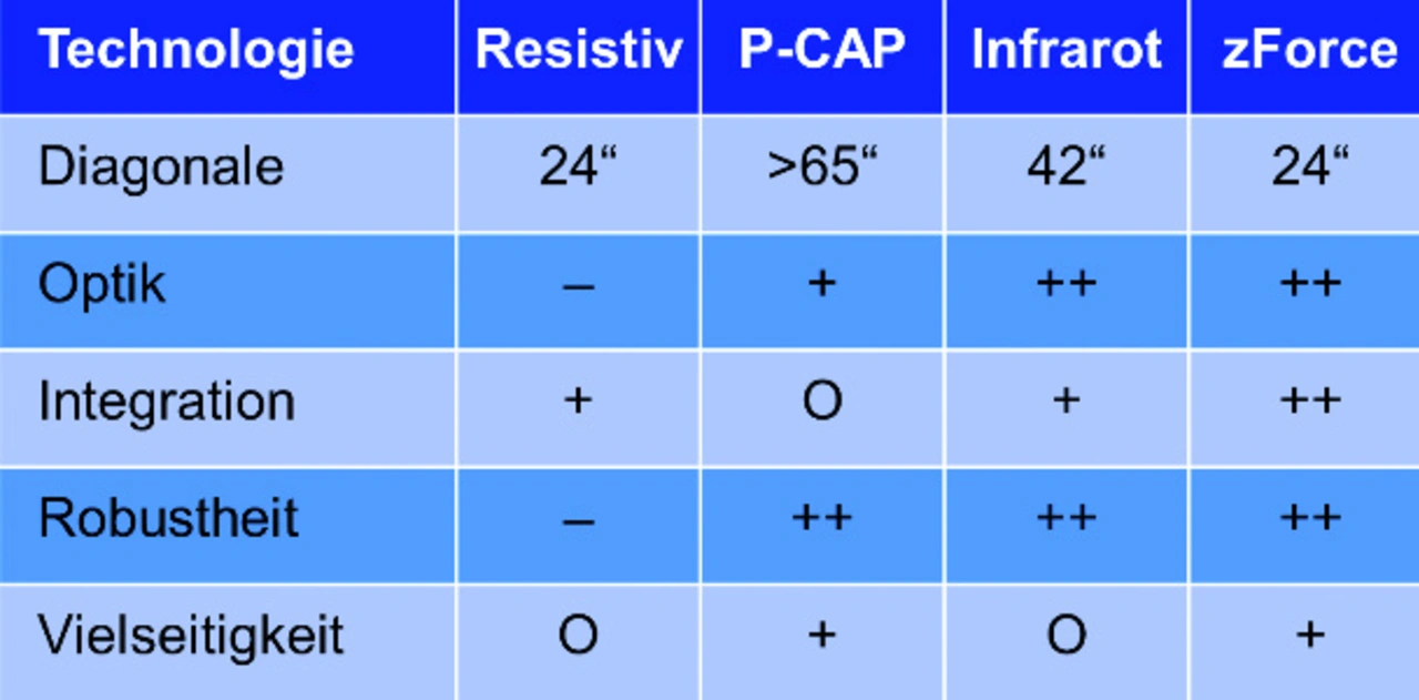 Im Vergleich mit anderen Technologien schneidet zForce gut ab. Insbesondere die fehlende Kopplung zum darunter liegenden Display ermöglicht Applikationen, die so mit anderen Touchscreens nicht realisierbar sind.