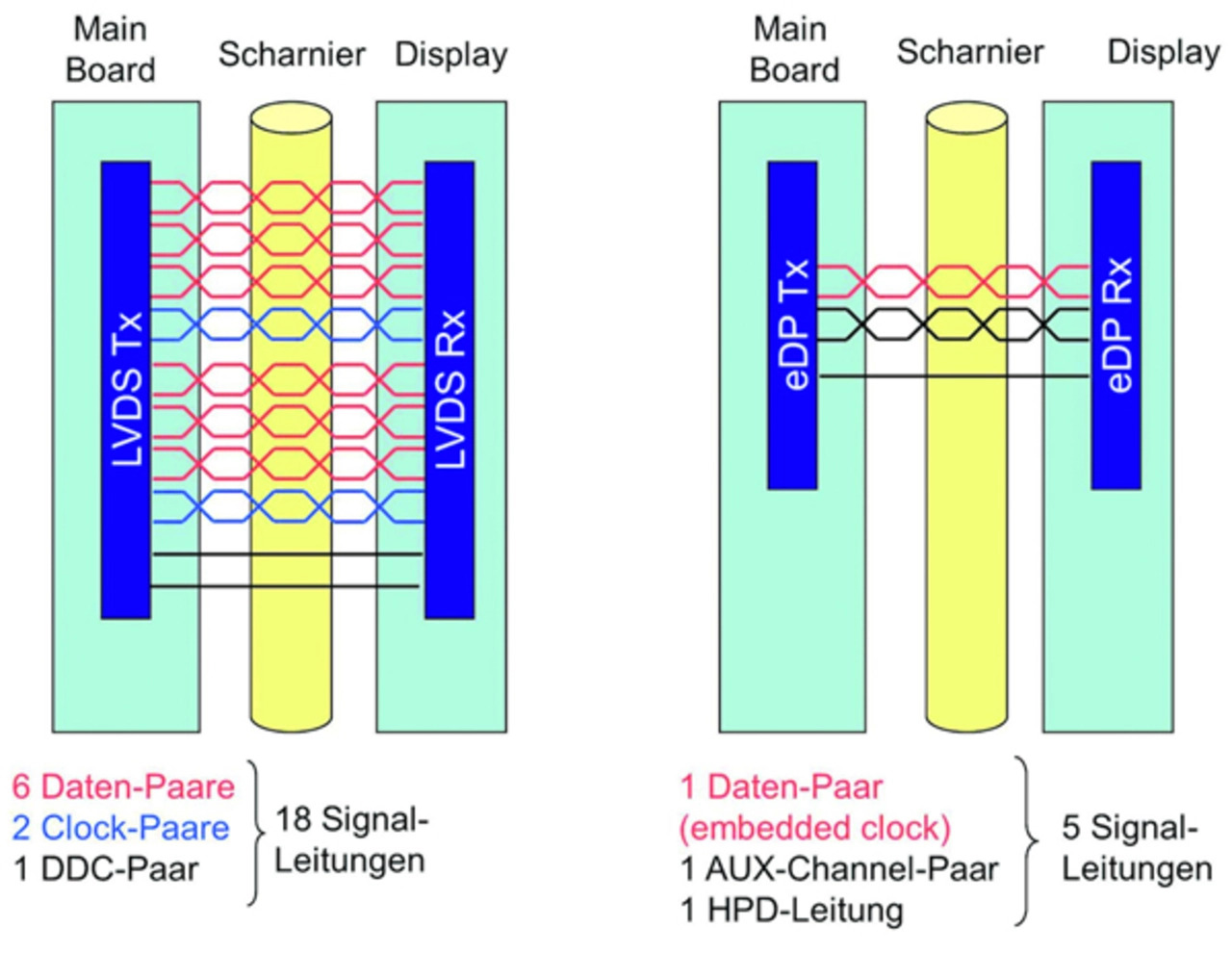 Eine interessante Applikation für eDP findet sich in vielen Notebook-Computern. Der Deckel mit dem Display muss gegenüber dem Grundgerät beweglich sein. Im Beispiel (Bild 5) benötigt eine konventionelle Verbindung mit 18 LVDS-Signalleitungen, eDP hingegen lediglich fünf. Das verwendete Display hat eine Auflösung von 1680 × 1050 und eine Farbtiefe von sechs Bits. Die Stromversorgung und das Backlight sind nicht berücksichtigt.