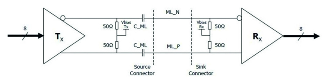 Embedded-DisplayPort ist eine Variante des DisplayPorts (siehe weiter unten). Das DisplayPort ist eine relativ neue Schnittstelle, die einen neuartigen Übertragungskanal definiert, siehe Tabelle 5. Die Videodaten werden serialisiert und als Datenpaket übertragen. Der Takt ist in das Datensignal eingebettet. Diese Schnittstelle ist extrem skalierbar und kann an vielfältige Anforderungen angepasst werden: Die Zahl der verwendeten Leitungspaare, hier Lanes genannt, kann zwischen eins und vier liegen, die Übertragungsrate der Videodaten kann verschiedene Werte annehmen. Zudem wurden die Möglichkeiten der Seitenbandkommunikation über den so genannten Aux-Kanal erheblich erweitert (siehe DVI: DDC). Die Bildquelle kann sich Informationen über den Status der Bildsenke und auch der Übertragungsstrecke verschaffen. Mit der Hot-Plug-Leitung kann sich die Bildsenke an der Quelle an- und abmelden. Die Bildquelle kann entsprechend darauf reagieren und zum Beispiel andere Quellen adressieren. Ein Beispiel dafür ist das Anstecken eines externen Monitors an einen Notebook-Computer. Elektrisch gesehen ist die DisplayPort-Schnittstelle wechselspannungsmäßíg entkoppelt (siehe Bild 4) , sodass Potentialunterschiede zwischen Quelle und Senke keine Rolle spielen. Außerdem wird dadurch die gleichspannungsfreie Übertragung über Medien wie Glasfaser erst ermöglicht.