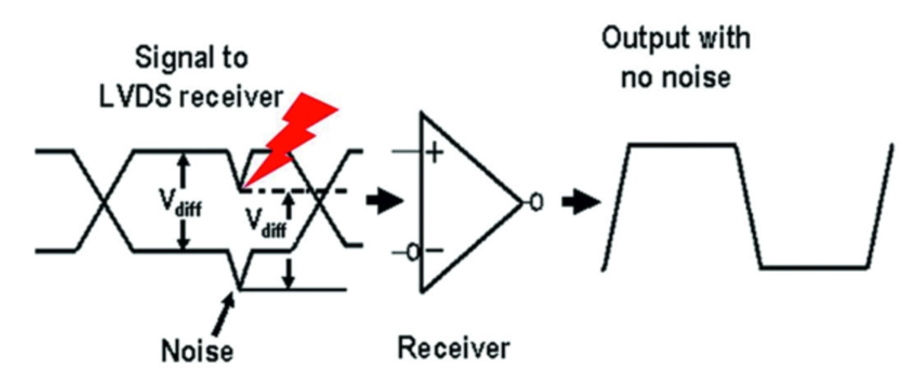 Die praktische Grenze für Displays mit CMOS-Schnittstelle liegt bei ungefähr WVGA (800 × 480 Bildpunkte). Doch bereits bei 320 × 240 Bildpunkten beginnt die Domäne der LVDS-Schnittstelle. Bei ihrer Definition wurden einige Schwachpunkte der parallelen Schnittstelle vermieden. Der Begriff LVDS steht für Low-Voltage-Differential-Signalling. Signale werden hier serialisiert auf wenige Leitungen übertragen (Bild 2), dabei ist der Pegel reduziert. Um die Störsicherheit bei kleineren Pegeln nicht nur zu gewährleisten, sondern die der Vorgänger noch zu übertreffen, wird jedes Signal in positiver und negativer Logik gleichzeitig übertragen, wobei die Leitungen durch Verdrillung in enger räumlicher Nähe liegen. Der Vorteil davon ist, dass Störsignale in gleicher Weise und Polarität auf die Leitungen einwirken und im Receiver durch Differenzbildung eliminiert werden. Diese Funktion differentieller Leitungen ist auch als »Common-Mode-Unterdrückung« bekannt (Bild 3). Darüber hinaus gibt der Sender die Signale mit kontrollierter Steilheit der Flanken aus, sodass abgestrahlte Störungen minimiert werden. Wie bei der Übertragung hochfrequenter Signale über Leitungen üblich, sind die Enden mit Widerständen terminiert. Dadurch können höhere Datenraten bei gleichzeitig weiteren Distanzen erzielt werden. Dass die Leistungsaufnahme für Sender und Empfänger gegenüber vergleichbaren Technologien geringer ist, ist nicht nur für tragbare Geräte mit Batteriebetrieb ein Vorteil.
