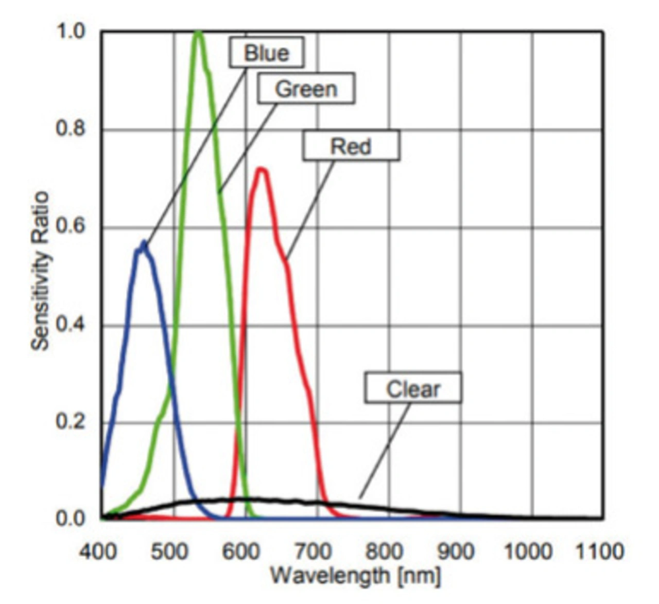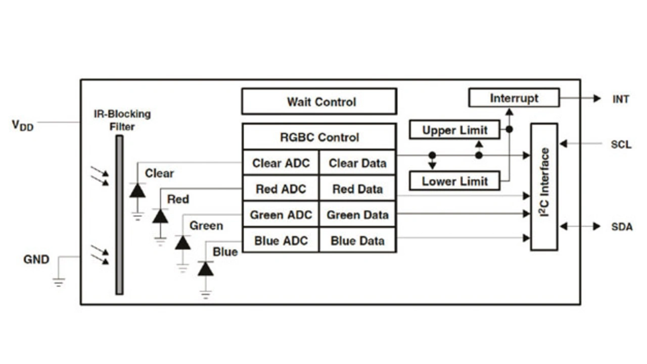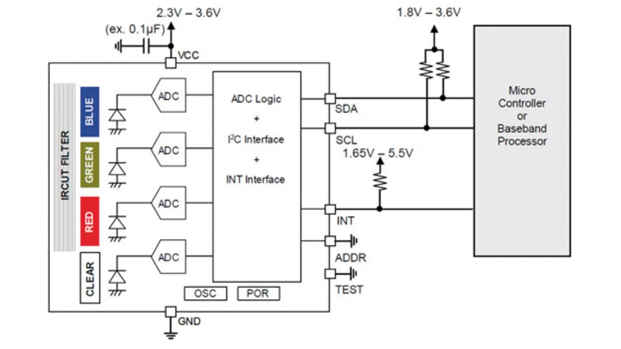 Die Zielanwendung des digitalen 16-bit-Farbsensor-IC BH1745NUC-E2 mit seriellem Ausgang von Rohm Semiconductor ist ein Umgebungslichtsensor zur Anpassung der LCD-Hintergrundbeleuchtung von Fernsehern, Mobiltelefonen oder Tablet-PCs. Der Sensor misst das UV- und IR-Licht über einen Weißlichtfilter und vor dem Rot-, Grün- und Blaufilter kommt ein IRCUT-Filter zum Einsatz (Bild 4). Beim BH1745NUC-E2 ist den optischen Rot-, Grün- und Blaufiltern ein IRCUT-Filter vorgeschaltet, damit die für das menschliche Auge geeignete Spektralempfindlichkeit zu den Analog/Digital-Wandlern (ADC) gelangen kann. Der IRCUT-Filter ist für sichtbares Licht durchlässig und sperrt Infrarotlicht. Der Weißlichtfilter unterstützt die Erzeugung für den Menschen realistischer Dimmalgorithmen, um Authentizität und niedrigeren Stromverbrauch zu gewährleisten. Die Verstärkung jedes 16-bit-A/D-Wandlers ist so vorprogrammiert, dass sie die bestmögliche Abbildung produziert, die dem visuellen Erlebnis am nächsten kommt (Bild 5). Der Dynamikbereich von 0,005 bis 40.000 Lux und die IRCUT-Eigenschaften des BH1745NUC-E2 machen ihn zu einer guten Wahl zur Ermittlung von Leuchtdichte und Farbtemperatur des Umgebungslichts.