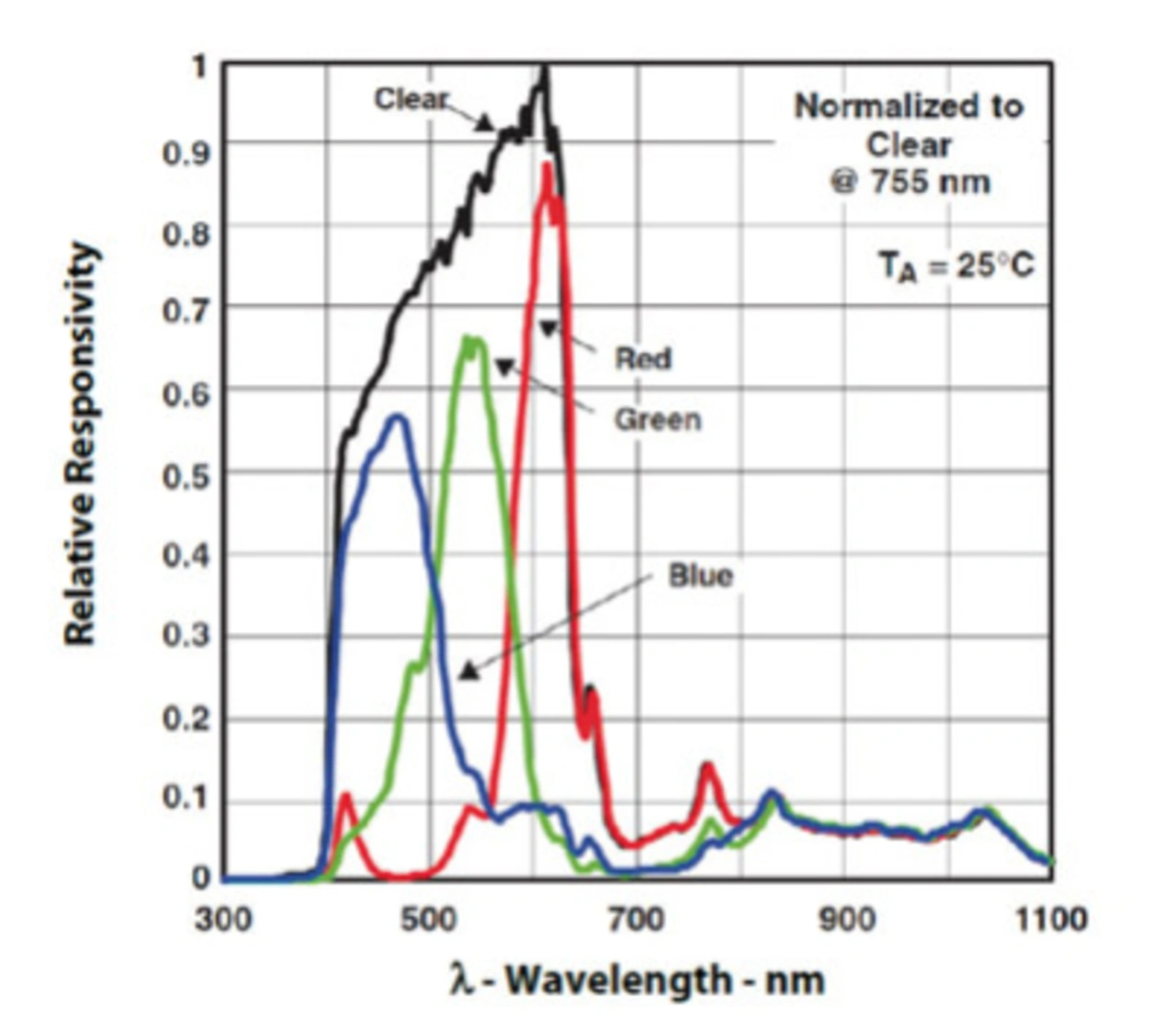 Zielanwendungen für den Farblichtdigitalisierer TCS34727FN mit IR-Filter von ams sind Fernseher, mobile Handgeräte, Tablets, Computer und Monitore. Bei der aktuellen Strategie mit dem TCS34727FN setzt ams auf eine andere Konfiguration der fünf optischen Filter. So wird bei der Filterkonfiguration des Sensors zuerst für alle vier Farbfilter (Rot, Grün, Blau und Weiß) ein IR-Sperrfilter verwendet (Bild 6). Er verfügt über vier integrierte Analog/Digital-Wandler, von denen die verstärkten Photodiodenströme gleichzeitig in digitale 16-bit-Werte umgewandelt werden. Der IR-Sperrfilter minimiert den Infrarotanteil des einfallenden Lichtspektrums und ermöglicht so exakte Farbmessungen. Die hohe Empfindlichkeit, der große Dynamikbereich und der IR-Sperrfilter machen den Umgebungslichtsensor zu einer idealen Farbsensorlösung für den Einsatz unter verschiedensten Lichtverhältnissen (Bild 7). Der TCS3472FN kann zwischen den einzelnen Messungen in einen energiesparenden Bereitschaftsmodus schalten, um den durchschnittlichen Stromverbrauch weiter zu senken.