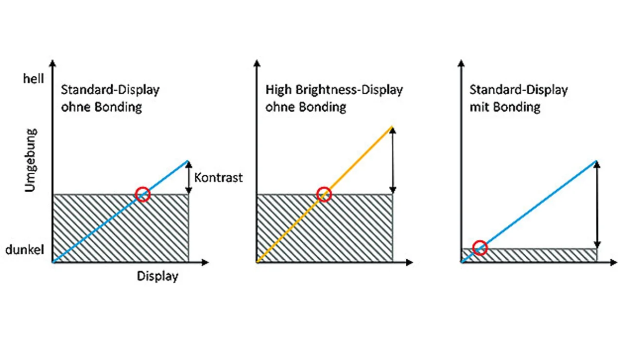Bild 3 zeigt den Vergleich eines Standarddisplays mit einer High-Brightness-Ausführung. Um bei gleicher Umgebungshelligkeit einen höheren Kontrast (Länge des Pfeils oberhalb der schraffierten Fläche) zu erzielen, wurde im Vergleich zum Standarddisplay links in der Mitte ein High-Brightness-Display verwendet. Beide Displays sind nicht gebondet. Ganz rechts wird das ursprüngliche Display verwendet, jedoch steigt der Kontrast allein durch Optical Bonding weit an.