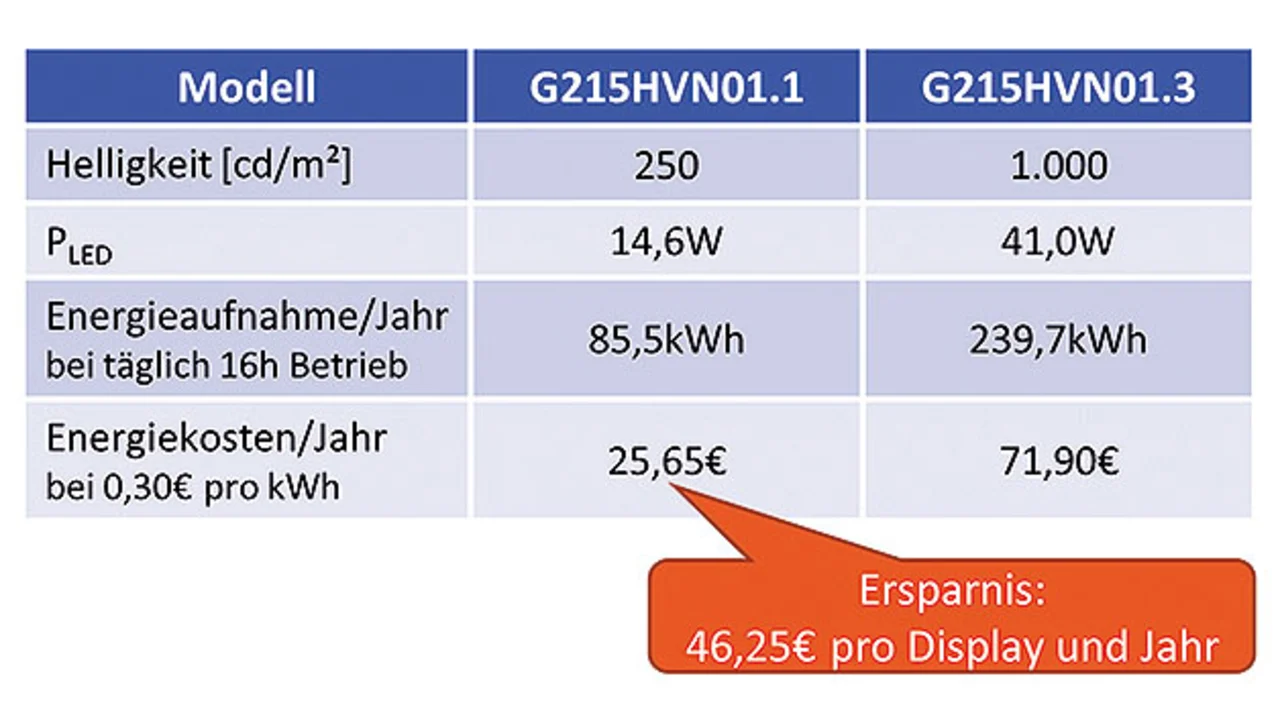 Ein Aspekt, der immer wichtiger wird, ist der ökologische Fußabdruck des Geräts, der durch die aufgenommene Energie geprägt wird. Beispielhaft wird ein Vergleich zwischen einem gebondeten Industriedisplay mit »normaler« Helligkeit von 250 cd/m² und einem ungebondetem High-Brightness-Typ mit 1.000 cd/m² durchgeführt. Dafür wird angenommen, dass bei den gewählten Umgebungslichtverhältnissen mit beiden Displays der gleiche Kontrast erzielt wird. Bei einem Preis von 0,30 € pro Kilowattstunde spart das Modell mit 250 cd/m² Stromkosten von knapp 50 € pro Jahr. Hinzu kommt, dass ein High-Brightness-Display mehr als 50 % teurer als das Standarddisplay ist. Das Netzteil muss für die stärkere Leistung ausgelegt sein und die Entwärmung des Gesamtsystems ist für den Konstrukteur vor allem im Outdoor-Bereich deutlich aufwendiger.
