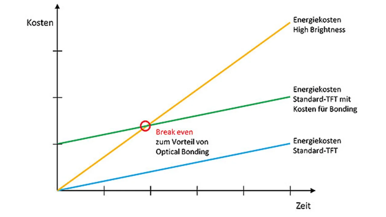 Das Standarddisplay ist nicht nur in der Anschaffung günstiger; auch ist nicht jedes Display in einer High-Brightness-Ausführung erhältlich. Die höheren Anschaffungskosten für das gebondete Display haben sich gegenüber den Energiekosten nach kurzer Zeit amortisiert, wie Bild 5 zeigt.