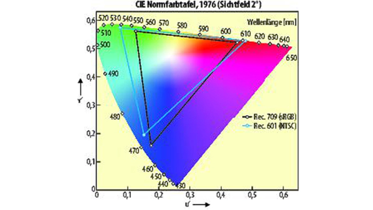In der Vergangenheit wurden verschiedene Standard-Farbbereiche definiert, wie etwa die in Bild 1 eingezeichneten Bereiche Rec. 601 (NTSC) und Rec. 709 (sRGB), die Anhaltspunkte für die relative Größe des Farbbereichs eines Displays liefern. Üblicherweise berechnet man hierzu die Fläche des vom Farbbereich eines Displays (im u’v‘-Bereich) umschlossenen Dreiecks und setzt diese ins Verhältnis zur Dreiecksfläche eines bestimmten Standard-Farbbereichs. Zum Beispiel ist ein Farbbereich, der 70 % des NTSC-Bereichs erreicht, ausreichend für ein Display von annehmbarer Qualität, während ein Farbbereich von 100 % NTSC eine wahrnehmbar bessere Farbqualität aufweist.