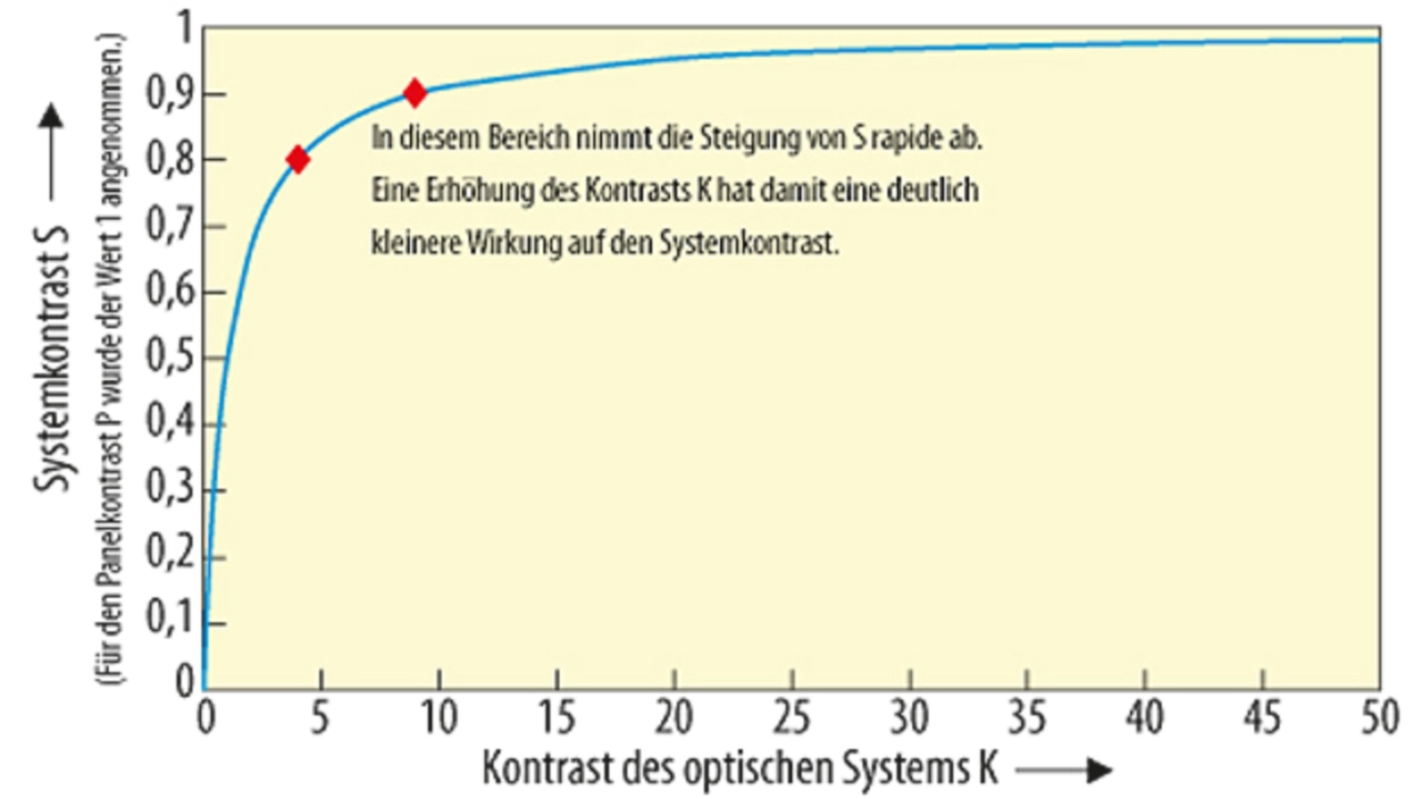 Bild 2 zeigt, wie sich der Systemkontrast S mit dem Kontrast K der Optik verändert (P ist hier der Einfachheit halber als 1 angenommen). Die Grafik zeigt, dass sich der System-Kontrast dem Panel-Kontrast annähert, je höher der Kontrast der Optik wird. Ebenso ist zu sehen, dass weitere Kontrasterhöhungen im optischen System immer weniger zur Erhöhung des Systemkontrasts beitragen. Im abgebildeten Fall würde man das optische System in der Regel so auslegen, dass dessen Kontrast im rot markierten Bereich liegt. Hier ist der Kontrast des optischen Systems viermal (linke Markierung) bzw. neunmal (rechte Markierung) größer als der Kontrast des Panel.