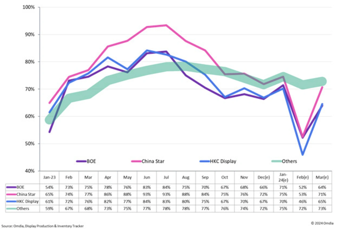 Dem geben die LCD-Panel-Hersteller allerdings nur sehr eingeschränkt nach und reagieren stattdessen mit einer weiteren Absenkung ihrer Produktion. Erwarten die Analysten im Januar noch eine Auslastung der Fabriken von 73 Prozent, soll im Februar ein Absturz auf nur noch 60 Prozent folgen. Am energischsten dürften dabei die chinesischen Hersteller vorgehen, die mehr als zwei Drittel des Marktes (67,5 Prozent) unter sich aufteilen. Die größten Kürzungen erwartet Omdias Principal Analyst Alex Kang bei BOE, China Star und HKC Display, die gerade erst ihre Produktionspause zum chinesischen Neujahrsfest von einer auf zwei Wochen ausgedehnt haben: »Infolgedessen liegt ihre durchschnittliche Fab-Auslastung im Februar 2024 bei 51 Prozent, während die anderen Hersteller bei 72 Prozent liegen werden.« Über das gesamte erste Quartal und alle Hersteller hinweg rechnen die Marktforscher mit einer durchschnittlichen Auslastung der Fabriken unter 68 Prozent. Ziel dieser Reduktion ist eine Stabilisierung der Preise bei gleichzeitigem Abbau des Überhangs.