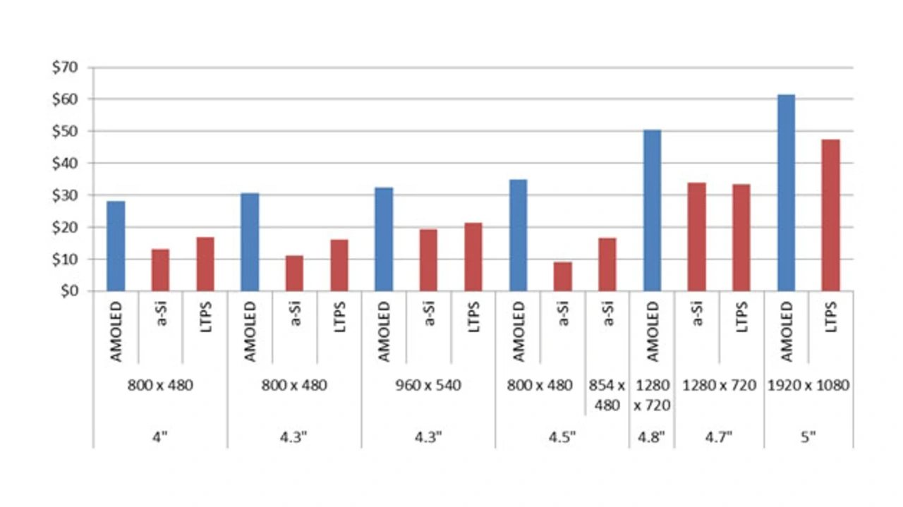 So geht der größte Umsatzschub für OLED-Displays in diesem Jahr logischerweise auch von Samsungs neuem Smartphone Galaxy S4 aus, das ein 5-Zoll-AMOLED-Display mit einer Full-HD-Auflösung von 1920 x 1080 Pixel hat und eine Pixeldichte von 440 ppi erreicht. Das ist ein bisher noch nicht dagewesener Wert für ein OLED-Display. Displaysearch geht davon aus, dass 2013 allein 52 Millionen dieser Displays verkauft werden, was bei einem Einzelpreis von etwas über 65 Dollar für einen Umsatz von rund 3,2 Mrd. Dollar steht. Der hohe Umsatz ist also nicht nur auf die Menge sondern auch auf die höheren Preise der OLED-Technik im Vergleich zu LCDs zurückzuführen (siehe Grafik).