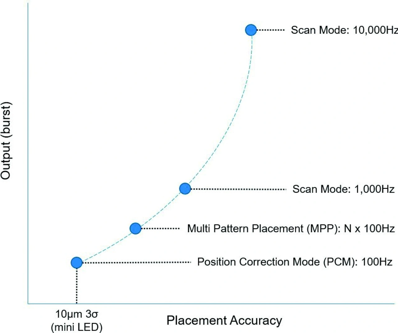 System lässt sich auf verschiedene Fertigungsprozesse in der Wertschöpfungskette anpassen. Im Position Correction Mode, PCM, erreicht es 10 μm Positioniergenauigkeit nach der Drei-Sigma-Regel, um die Anforderungen an die fortschrittlichsten Mini-LED-Anwendungen zu erfüllen.« Sind geringere Genauigkeiten ausreichend, kann in ein Multi-Pattern-Placement- oder einen Scan-Modus mit deutlich höherem Durchsatz gewechselt werden. »Wir verwenden eine laserbasierte Methode, wobei der Laser über einen Roboterarm verfahren wird. Der Durchsatz lässt sich durch Verkürzen der Roboter-Bewegungsphase erhöhen, was immer zulasten der Genauigkeit geht.« Das Verfahren ist auf die Bestückung von TFT-Backplanes ausgelegt. Sollte sich ein Display-Hersteller für die Ansteuerung über Treiber-ICs entscheiden, lässt sich das Verfahren in einem Entwicklungsprojekt entsprechend modifizieren, sagt David Trasobares Paris.