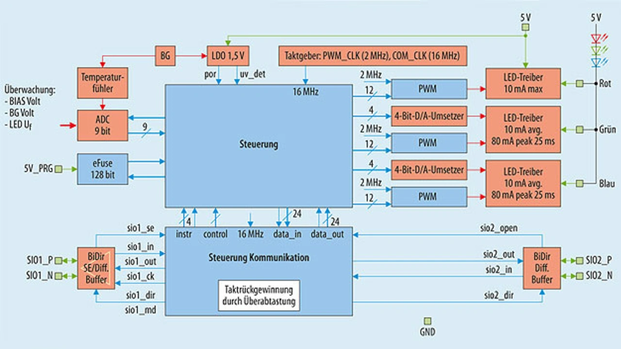 Im Gegensatz dazu basiert die ISELED-Ansteuerung auf RGB-LEDs mit integriertem, intelligenten und busfähigem Steuer-IC mit Alterungskompensation und Temperaturfühler. Alle Komponenten sind in einem Gehäuse mit nur 3 × 4 × 0,6 mm Abmessungen untergebracht. Die Kalibrierdaten hinterlegt der LED-Hersteller direkt im Steuer-IC (Bild 7). Der MCU übermittelt dann nur noch die Parameter für Farbkoordinaten und Helligkeit. Das geschieht mit einer Datenrate von bis zu 2 Mbit/s. Die restliche Regelung zur Kompensation von Helligkeitsschwankungen findet lokal an der LED statt.