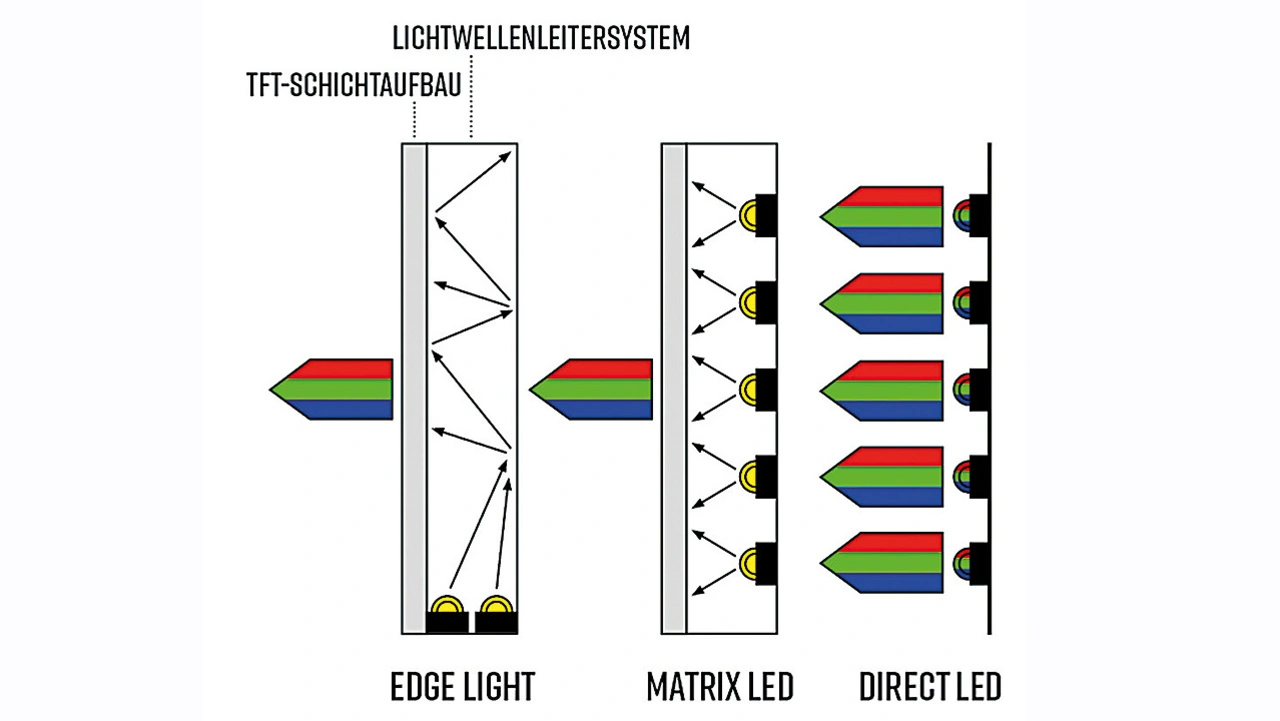 Auch bei TFTs gibt es aktuelle Weiterentwicklungen, indem Licht direkt von einer großflächigen LED-Matrix als Backlight eingestrahlt wird (Bild 1). Auf diesem Weg kann eine viel größere Menge Licht direkt durch das Display emittiert werden. Zusätzlich ist es möglich, die LED-Matrix lokal anzusteuern, um dadurch die Helligkeit sowie den Kontrast und damit schlussendlich die Bildqualität noch einmal deutlich zu erhöhen. Dieses Backlight-Matrix-LED-TFT-Display ist jedoch kein LED-Display im eigentlichen Sinne