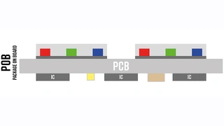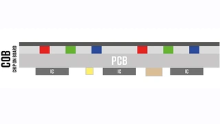 Unter »Chip on Board« (COB) versteht man die Montage der einzelnen LEDs direkt auf einer Leiterplatte (Bild 3). Die roten, grünen und blauen LEDs werden, vereinfacht dargestellt, über ein Stempelverfahren einzeln aufgebracht. Die sehr kleinen, empfindlichen LEDs werden anschließend mit einer transparenten Schicht versiegelt und geschützt. Vorteile dieses Verfahrens sind die kostengünstige Herstellung und der flache Aufbau von Displays. Zu den Nachteilen gehört, dass eine Reparatur durch den Ersatz von beschädigten LEDs nur bedingt möglich ist.