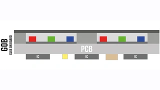 Bei der Variante »Package on Board« (POB) werden RBG-LEDs in einem gemeinsamen Gehäuse anstelle von einzelnen LEDs verwendet (Bild 4). Diese bereits in einem Gehäuse gekapselten drei einzelnen Farb-LEDs werden maschinell über ein »Pick-and-Place«-Verfahren auf die Leiterplatte gebracht. Aus Herstellungssicht eine zeitaufwendigere Herstellungsvariante, jedoch ist das Endprodukt später stabiler und kann, falls nötig, punktuell repariert werden. Um die Produktfestigkeit von POB-LED-Displays zu verbessern, kann zusätzlich zwischen den LED-Gehäusen ein Epoxidharz gegossen und ähnlich wie bei den COBs eine Versiegelung aufgebracht werden. Diese spezielle Abschirmung wird »Glue on Board« (GOB) genannt (Bild 5). Sie reduziert die Reflexion und ist aufgrund des höheren Schutzes für Anwendungen im Außenbereich besonders geeignet.