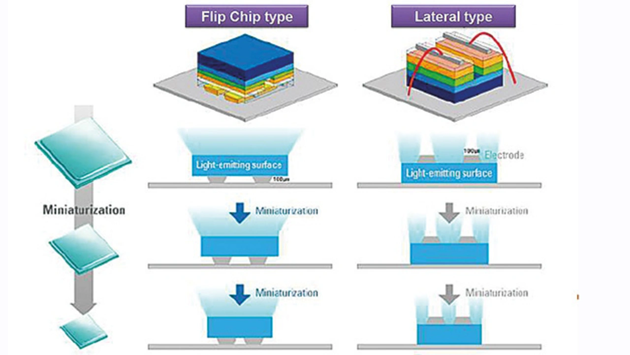 Yenrich verwendet ausschließlich LEDs mit Flip-Chip-Technologie. Dabei ist der Schichtaufbau der LED umgedreht, wobei die Kontaktierung der LED von unten erfolgt. LED-Standardtechnologie ist die »Lateral-Type«-Anwendung, bei der durch dünne Golddrähte die LED an der Emissionsseite (oben) kontaktiert wird. Diese Kontaktierungsmethode erhöht die Streuung des Lichts, was zu einer Verschlechterung des Farbspektrums und der gesamten Emissionsmenge führt (Bild 7). Bei zunehmender Miniaturisierung der LEDs nimmt dieser Effekt massiv zu. Weitere wichtige Vorteile bei der Verwendung von Flip-Chip-LEDs ist die bessere Wärmeabfuhr und die damit einhergehende bessere Langlebigkeit der LEDs.