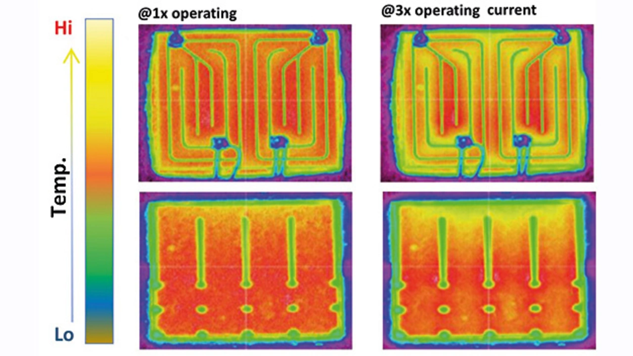 Gerade in Zeiten von gesteigertem Umwelt- und Stromverbrauchsbewusstsein ist die Verwendung von Flip-Chip-LEDs mit sehr hoher Energieeffizienz ein maßgeblicher Entscheidungsfaktor für den Einsatz im Feld. Es gilt: Je stärker der Strom, desto heller das Display und umso größer der Unterschied zwischen Lateral-Typ und Flip-Chip-Typ, wie in Bild 8 zu sehen.