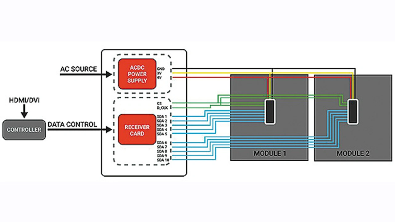 Der modulare Aufbau des IF09HP0.0 ermöglicht eine beinahe unendliche Erweiterung. Beispielsweise bilden sechs (3 x 2) Module des IF09HP0.0 das anschlussfertige Cabinet D09NWG0.0 mit einer Auflösung von 640 x 360 Pixeln und einer Größe von 68,58 cm (600 mm x 337,5 mm x 45 mm). Das entspricht einer Bilddiagonale von 27 Inch. Im Gegensatz zu einem normalen TFT, bei dem der gesamte Bildinhalt an den Display-Controller weitergegeben wird, benötigt das Cabinet einen externen Videocontroller, um ein Bild darzustellen. Dieser Videocontroller unterteilt das darzustellende Bild in einzelne, den LED-Modulen (IF09HP0.0) entsprechende Segmente und steuert diese separat an, um auf dem Cabinet (D09NWG0.0) das Gesamtbild darzustellen (Bild 10).