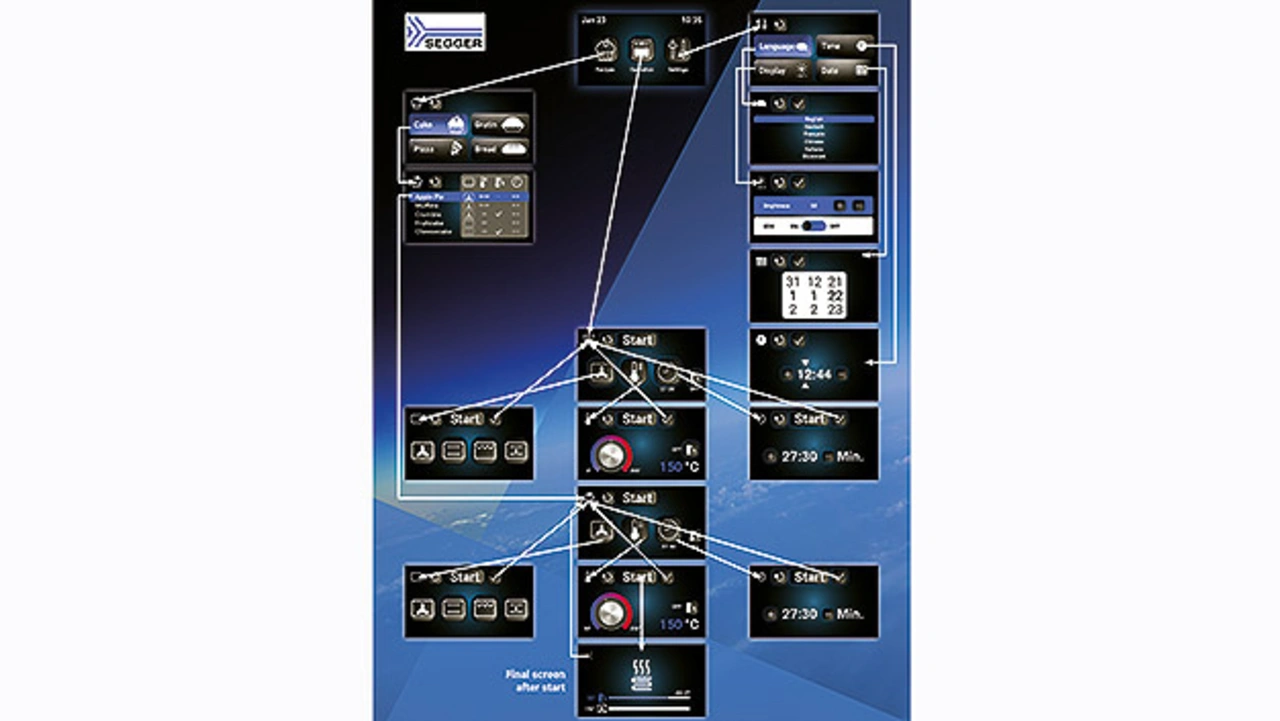 Die Funktion dieser Demo-Anwendung ist im Vergleich zu handelsüblichen Backöfen etwas eingeschränkt, zeigt aber alle wichtigen Funktionen wie Betriebsart, vordefinierte Rezepte, Temperatur, Backzeit und ist sogar mehrsprachig implementiert. Bild 1 zeigt die implementierte Benutzeroberfläche vom Start bis zum Beginn des Backvorgangs.
