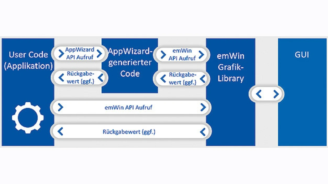 Der einer GUI zugeordnete Code ist nur ein Teil einer vollständigen Anwendung. Um den vom AppWizard generierten GUI-Code in die vollständige Anwendung einzubinden, stellt AppWizard eine benutzerfreundliche API bereit, die vom User-Code zur Interaktion mit der GUI verwendet werden kann. Obwohl AppWizard ein sehr leistungsfähiges Tool ist, deckt es (noch) nicht alle der umfangreichen Funktionen von emWin ab. Daher kann der User-Code weiterhin reguläre emWin-API-Aufrufe verwenden, um die erforderliche GUI-Funktion zu ergänzen, die noch nicht von AppWizard abgedeckt wird. Dadurch ist es möglich, GUIs zu erstellen, die teilweise von AppWizard-generiertem Code und teilweise von User-Code gesteuert werden (Bild 9).