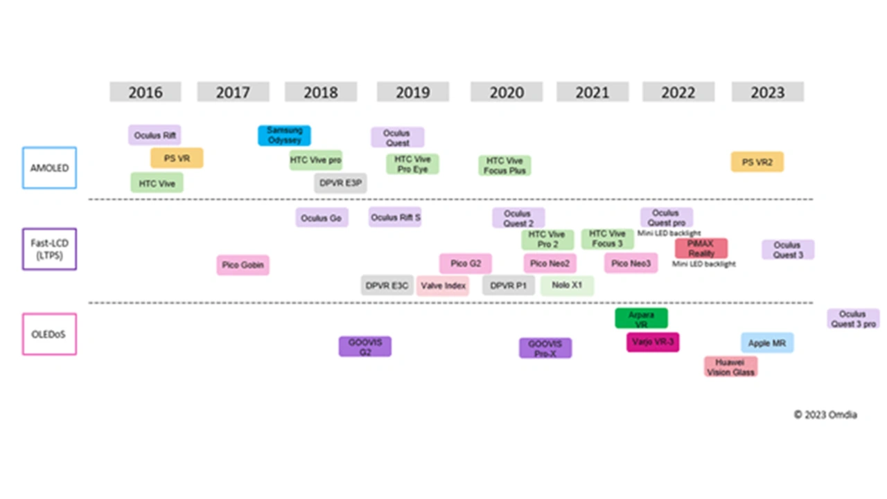 TFT-LCD- und AMOLED-Displays sind bei VR-Anwendungen dominierend. Beide sind aktuell auch die ausgereiftesten Display-Techniken für augennahe Anzeigen. OLEDoS (organic light emitting diode on silicon) – auch bekannt als Micro-OLED – bietet eine bessere visuelle Leistung als TFT-LCD und AMOLED, aber sein Marktanteil bleibt wegen der hohen Kosten begrenzt. Bislang haben nur einige wenige XR-Geräte OLEDoS eingesetzt, die Liefermengen sind auch aufgrund der High-End-Positionierung sehr gering.