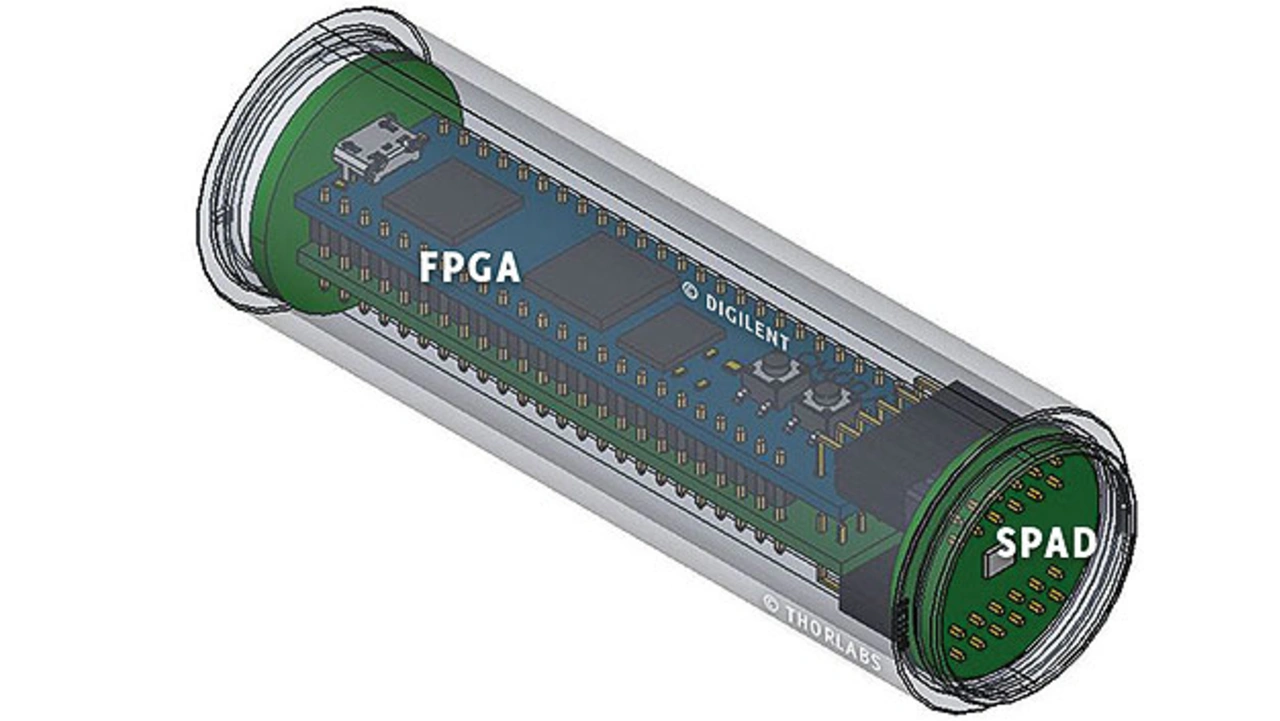 Kostengünstiges, handflächengroßes USB-Gerät Das TCSPC-Verfahren ist zur Charakterisierung schneller Lichtquellen hervorragend geeignet und zeigt u. a. Effekte auf, die bei der Messung der Impulsantwort durch Photodiode und Oszilloskop nicht sichtbar wären. Das gemeinsam mit X-Fab entwickelte System erlaubt die Messung von <1 ns breiten Lichtpulsen mit einem Dynamikbereich von 80 dB. Die Kombination aus FPGA-TDC und CMOS-SPAD erlaubte die Verkleinerung des TCSPC-Messaufbaus von einem zuvor äußerst sperrigen Messaufbau zu einem kostengünstigen, handflächengroßen USB-Gerät, welches ohne externe Spannungsversorgung auskommt. Das System ist vollständig in einem Objektivtubus mit einem Durchmesser von einem Zoll untergebracht. Dadurch kann es auch durch eine Vielzahl kommerziell erhältlicher optischer Komponenten (z. B. Linsen, Filter) ergänzt werden. Im Forschungsprojekt FluoResYst kam das Messsystem bereits zur Charakterisierung schneller Laserlichtquellen zum Einsatz. Hierdurch konnte die Machbarkeit zur Entwicklung eines SPAD-basierten ASICs zur Detektion von Tuberkulose erfolgreich bewertet werden.