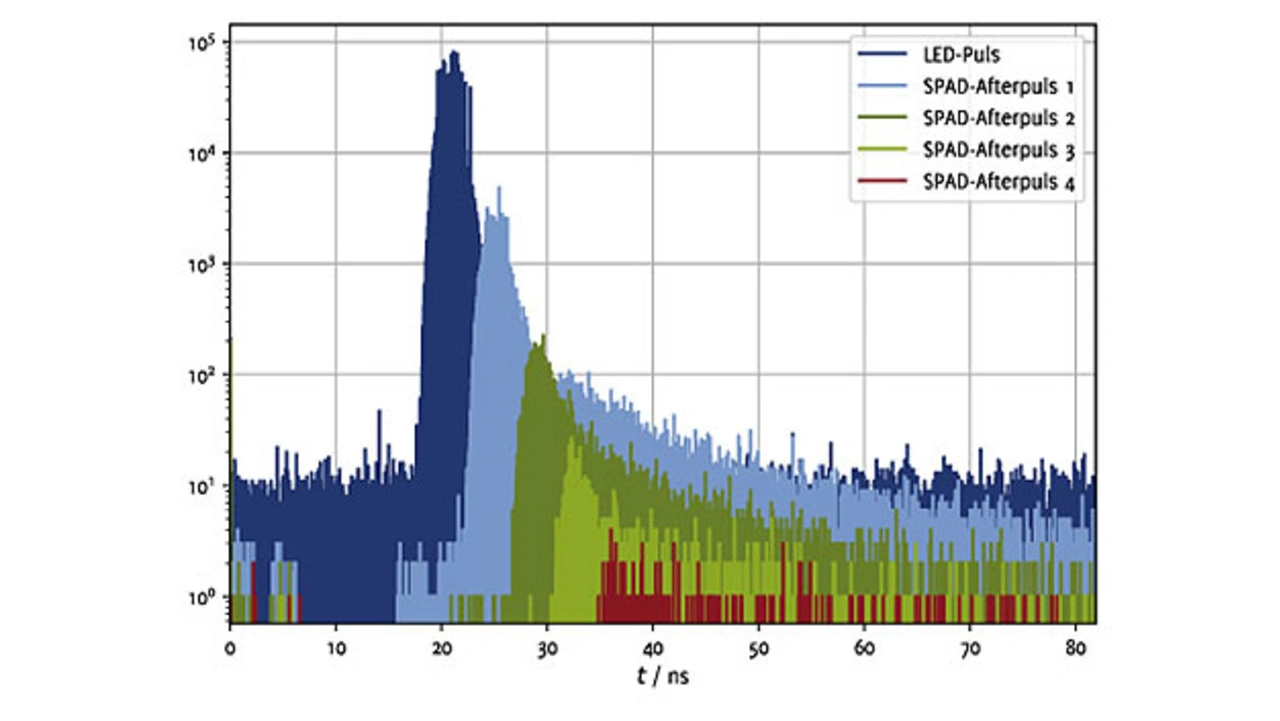 Mit dem entwickelten SPAD-EvalKit können auch unerwünschte Effekte der Lichtquelle und des Detektors beobachtet und quantifiziert werden. So kann z. B. das Afterpulsing der SPAD durch geeignete Korrelation herausgefiltert werden (Bild 3). Dieser unerwünschte Effekt wird durch den Detektor verursacht: Nachdem dieser ein Photon erfasst hat, können aufgrund der in einer Halbleiterschicht eingeschlossenen Ladungsträger unmittelbar weitere Pulse emittiert werden, die allerdings keinem Photon zuordenbar sind. Dieser Effekt wird als Afterpulsing (Nachpulsen) bezeichnet. Mit dem SPAD-EvalKit kann dieses Afterpulsing entweder für den normalen Betrieb ausgeblendet oder zur Charakterisierung des Detektors gezielt extrahiert werden.