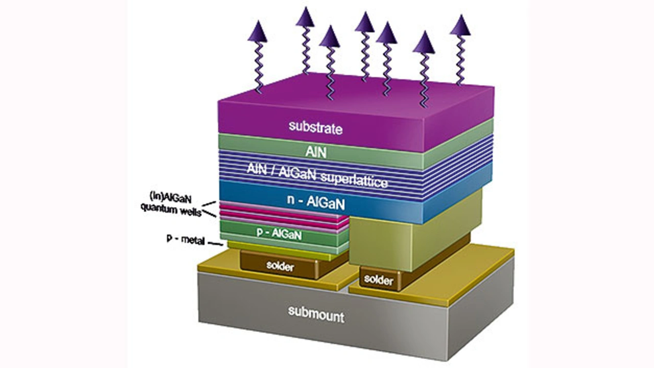 Je kurzwelliger die Strahlung, umso niedriger ist die erzielbare Ausgangsleistung und umso komplexer wird die Struktur aus den vielen verschiedenen Schichten (Bild 1). So sind die LEDs für die Bereiche UV-B (315 – 280 nm) und UV-C (280 – 200 nm) denen für UV-A (400 – 315 nm) noch unterlegen. Hier besteht weiterhin hoher Forschungs- und Entwicklungsbedarf. Für Vakuum-UV (200 – 100 nm) und Extrem-UV (<100 nm) sind in absehbarer Zeit überhaupt noch keine in Sicht, weil es kein geeignetes Halbleitermaterial mit entsprechend hohem Bandabstand gibt.