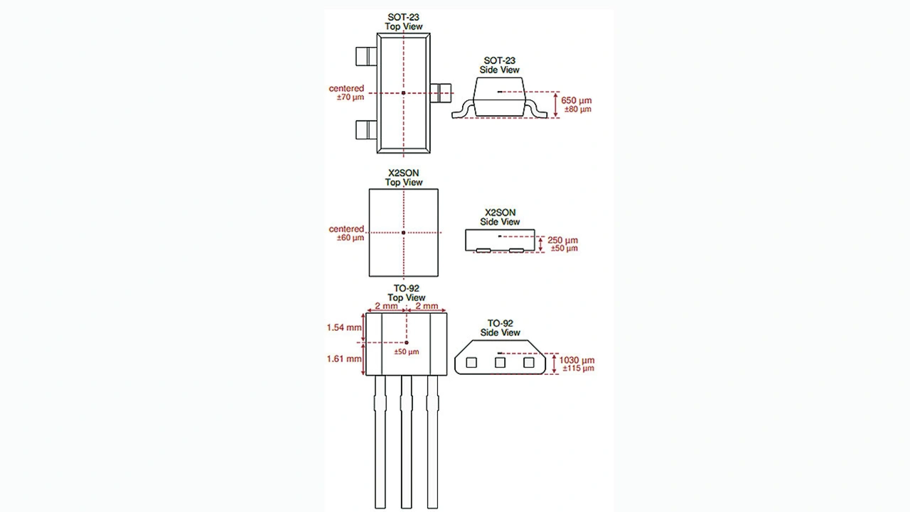 In Bild 5 ist die Lage des Sensorelements in oberflächenmontierbaren Halleffekt-Sensoren der Gehäusebauarten SOT-23 und X2SON (Extra-Small Outline No-lead) zu erkennen. Wird der Magnet 5 mm oberhalb der Leiterplattenoberfläche montiert, ist der Abstand zwischen Magnet und Sensorelement bei der SOT23-Version mit 4,35 mm kleiner als bei der X2SON-Ausführung (4,75 mm), sodass der SOT-23-Sensor eine höhere magnetische Flussdichte erfasst als der Sensor im X2SON-Gehäuse.