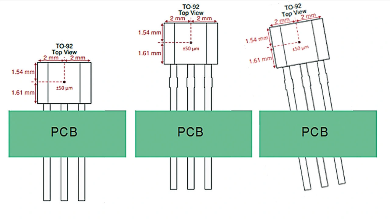 Bei Gehäusen für Durchsteckmontage, wie etwa der Bauform TO-92 (Bild 6) hängt die Lage des Sensorelements zusätzlich davon ab, in welcher Distanz zur Leiterplatte der Baustein montiert wird. In der Mitte in Bild 6 etwa befindet sich das Sensorelement in größerer Entfernung zur Leiterplattenoberfläche als links, sodass hier unterschiedliche magnetische Flussdichten gemessen würden.