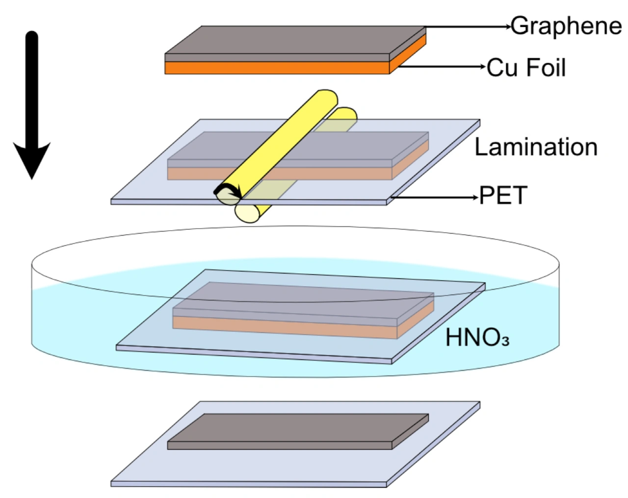 Nun berichten Munis Khan und seine Kolleginnen und Kollegen über eine überraschend hohe Ladungsträgermobilität von CVD-Graphen, das auf unpolierter Kupferfolie gezüchtet und mit einem gewöhnlichen Bürolaminierer und Nass-Ätzen von Kupfer auf EVA/PET-Laminierfolie übertragen wurde. Zwar weist das CVD-Graphen, das durch Heißpresslaminierung von Kupfer auf einen gewöhnlichen Laminierbeutel übertragen wurde, zunächst eine geringe Ladungsträgerbeweglichkeit in einem Bereich von 500 bis 1000 cm²/(Vs) auf. Wurden solche Filme jedoch mehrere Stunden lang bei +60 °C in einer Stickstoffatmosphäre gelagert, stieg die Mobilität um das Achtfache und erreichte bei Raumtemperatur 6000 bis 8000 cm²/(Vs).