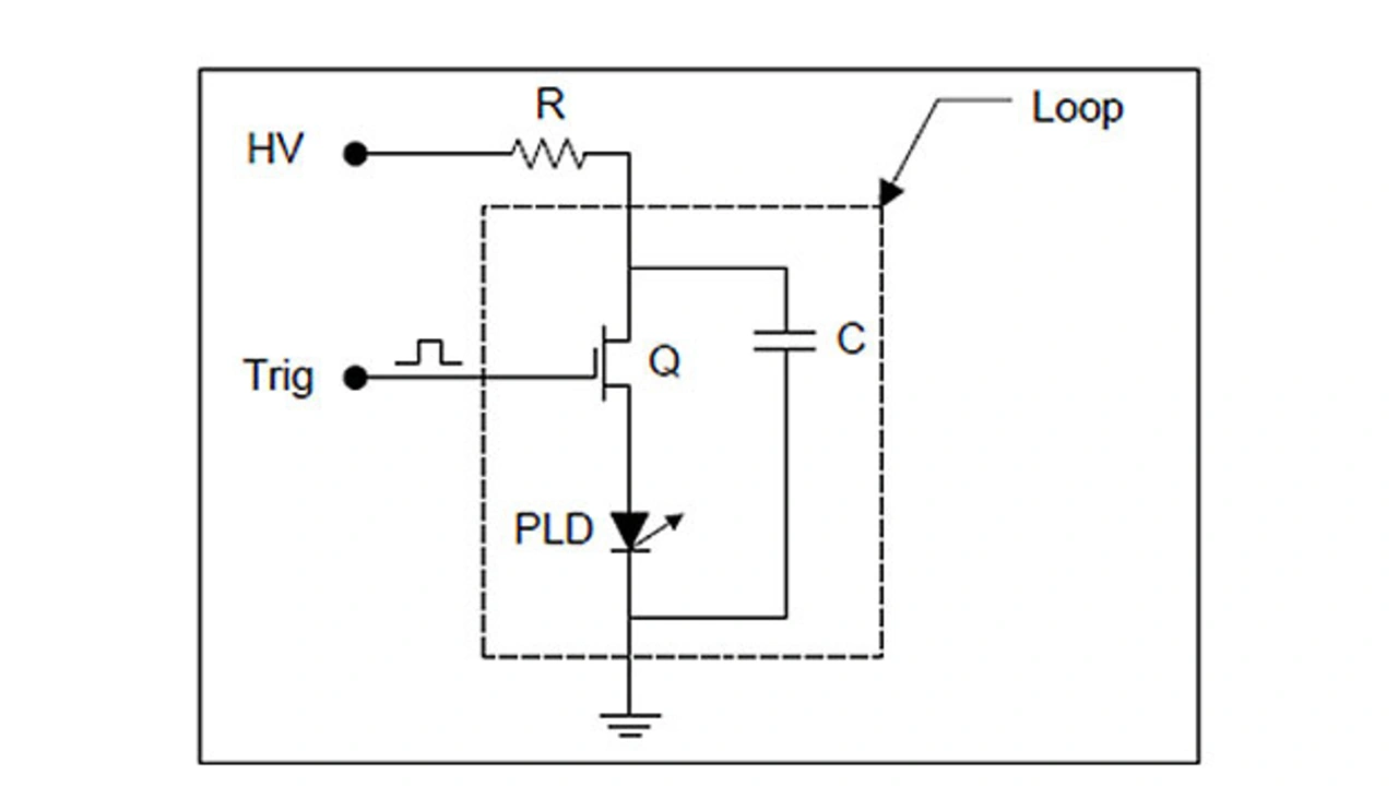 Diese Elemente bilden die Ansteuerschleife (Loop). HV bezeichnet die Ladespannung zum Aufladen des Kondensators zwischen den Impulsen; der Widerstand (R) dient zur Strombegrenzung während des Aufladezyklus und Trig ist das Triggersignal, mit dem der Transistor eingeschaltet wird. Der Wert von (R) bestimmt die Impulswiederholfrequenz, die der Schaltkreis bei voller Leistung liefern kann.