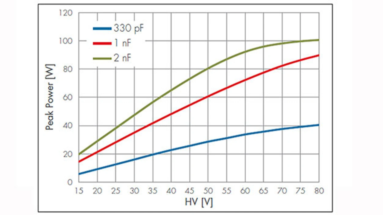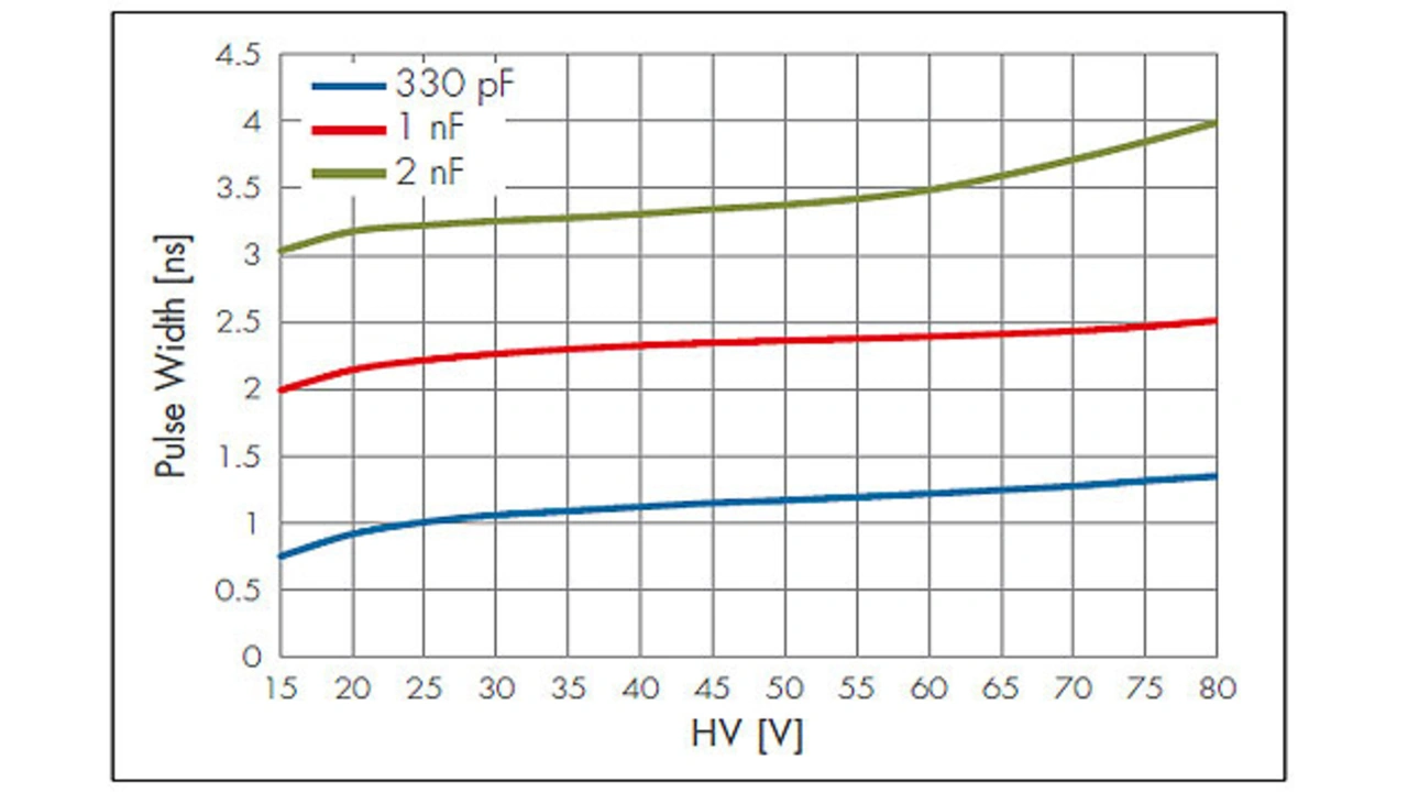 Der Transistor fungiert als Schalter zum Laden und Entladen des Kondensators. In den meisten Fällen kommen dabei Galliumnitrid-Feldeffekttransistoren (GaN FET) zum Einsatz. Im Vergleich mit anderen FETs auf Siliziumbasis bieten sie höhere Schaltgeschwindigkeiten und einen geringeren Stromverbrauch. Bei der Auswahl sind gleich mehrere Faktoren entscheidend: Zunächst muss der FET der hohen Spannung standhalten, die benötigt wird, um den Kondensator aufzuladen. Gleichzeitig muss er aber auch möglichst klein sein, sodass er nahe genug an den anderen kritischen Komponenten verbaut werden kann, um parasitäre Induktivität zu vermeiden. Des Weiteren sollte er eine niedrige Gate-Kapazität und einen niedrigen Widerstand aufweisen und so eine schnelle Reaktionszeit und eine hohe optische Leistung ermöglichen. Diese Eigenschaften können oft miteinander in Konflikt geraten. Daher kommt es auch hier darauf an, den besten Kompromiss für die Anwendung zu finden.