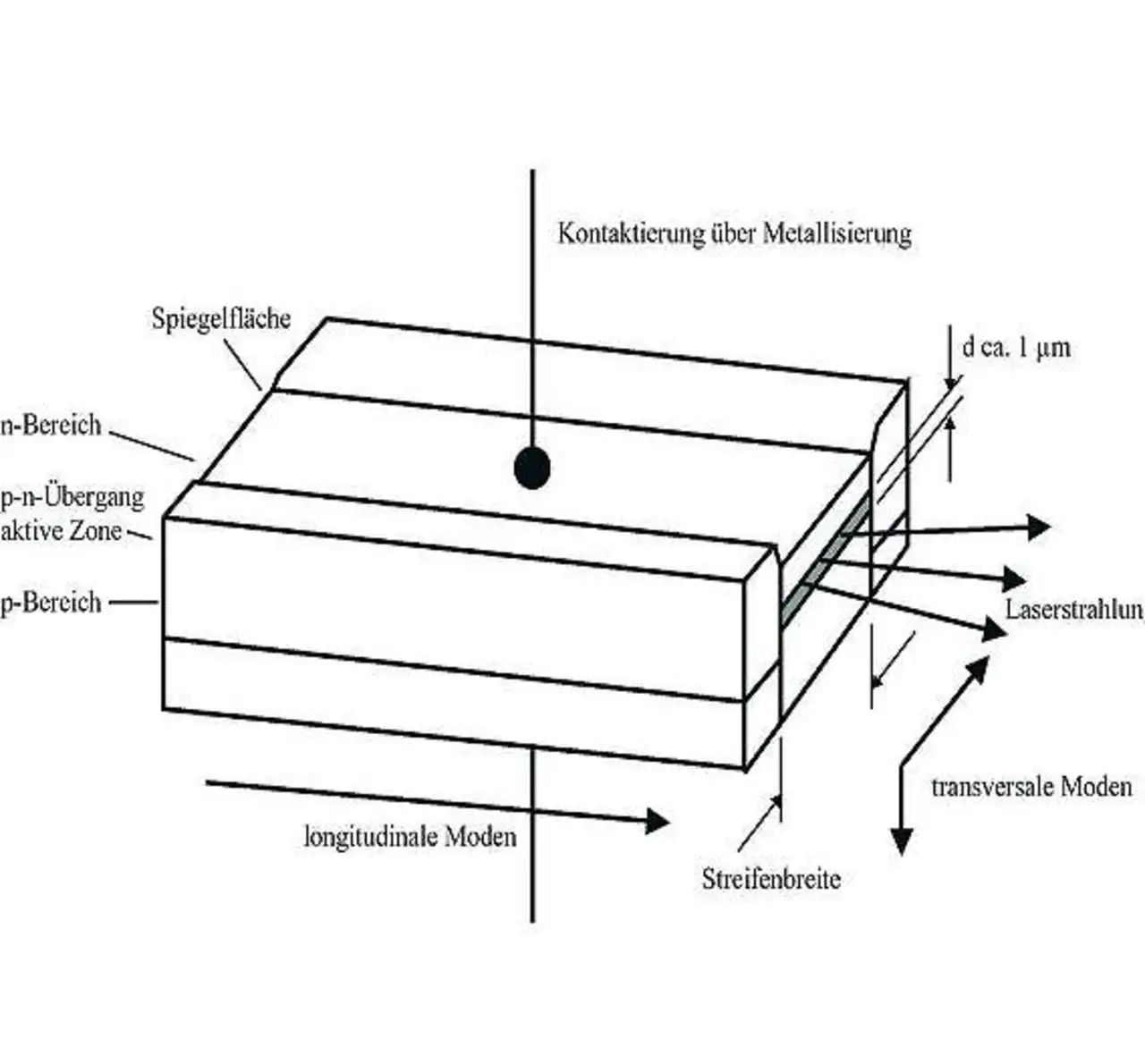 Die Abmessungen der lichtemittierenden Fläche (Ausdehnung des pn-Übergangs) geben die transversale Modenstruktur vor (Bild 1). Typischerweise beträgt die Abmessung in Richtung des pn-Übergangs d = 1 µm. Die Breite des Übergangs (Streifenbreite) variiert von circa 3 µm bis zu 500 µm. Laserdioden mit 3 µm Streifenbreite sind mit um 200 mW im nahen Infrarot und bis etwa 35 mW im sichtbaren Spektralbereich erhältlich. Sie weisen transversale Singlemodigkeit auf, auch wenn der Strahl durch unterschiedliche Divergenzen senkrecht und parallel zum pn-Übergang elliptisch ist.