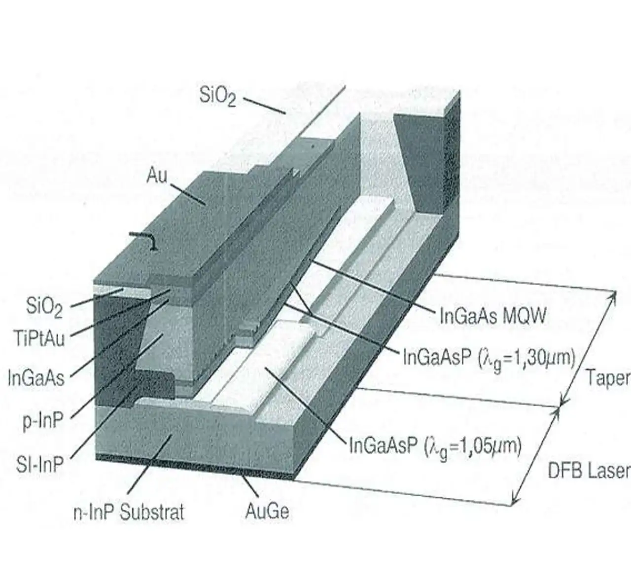 Einen ganz anderen Schwerpunkt setzen DFB-Laser. Das Bragg-Gitter innerhalb ihrer aktiven Zone erlaubt eine spektrale Breite von wenigen Megahertz. Beim DFB-Laser in Bild 3 dient eine zusätzliche, getaperte Struktur der einfacheren Faserkopplung.