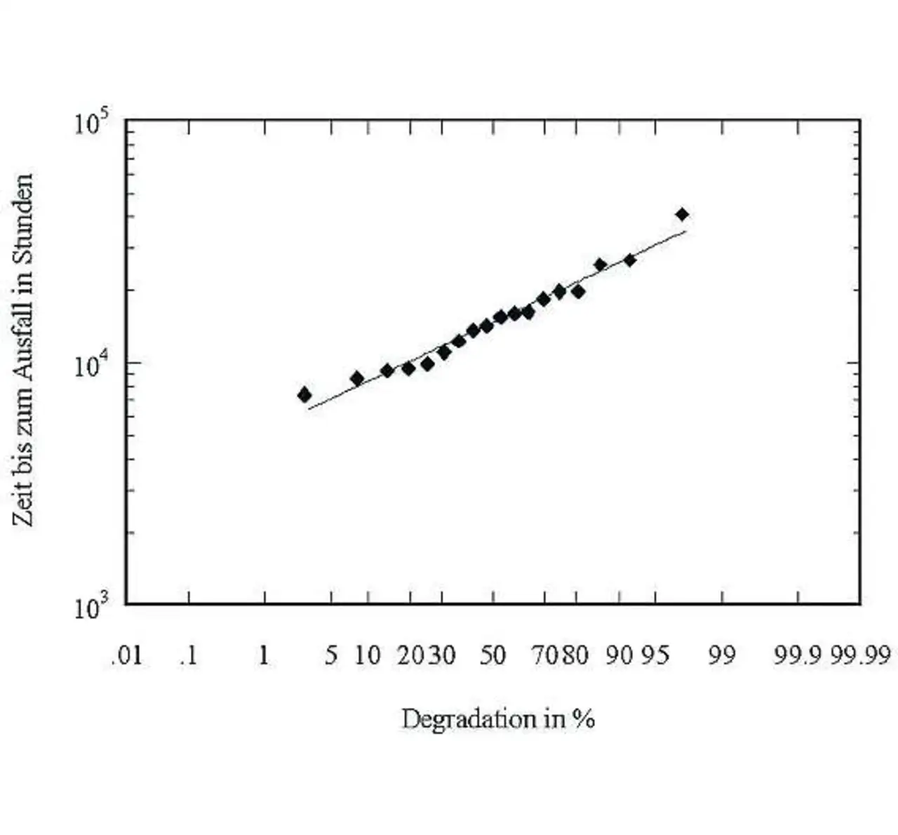 Als erstes Beispiel wird die Lebensdauer eines 40-W-Barrens, der bei einer Wellenlänge von 808 nm emittiert, untersucht. Diese Barren dienen zum Pumpen von Nd-YAG-Lasern. Durch die lange Lebensdauer verlängern sich hier die Wartungsintervalle im Vergleich zu mit Blitzlampen gepumpten Lasern. Bei +45 °C Wärmesenkentemperatur liefert das Experiment bei 40 W optischer Leistung eine mittlere Lebensdauer von 15 000 h (Bild 4).