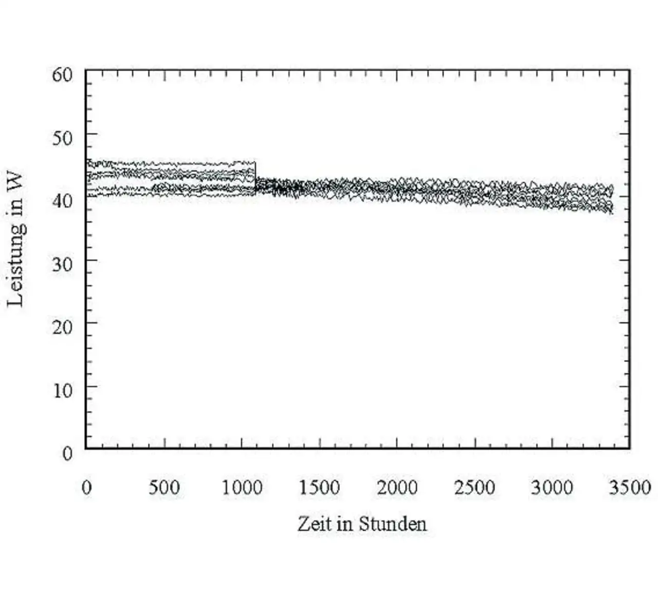 In Bild 5 ist der beschleunigte Lebensdauertest für 1,4 W und +70 °C (Wärmesenkentemperatur) für 18 Dioden abgebildet. Über 3500 h hinweg ist kein Ausfall aufgetreten. Dies liefert 72 000 Diodenstunden ohne Ausfall. Es wurden weitere Messungen mit insgesamt 54 Dioden durchgeführt mit dem Ergebnis von 170 000 Diodenstunden ohne Ausfall.
