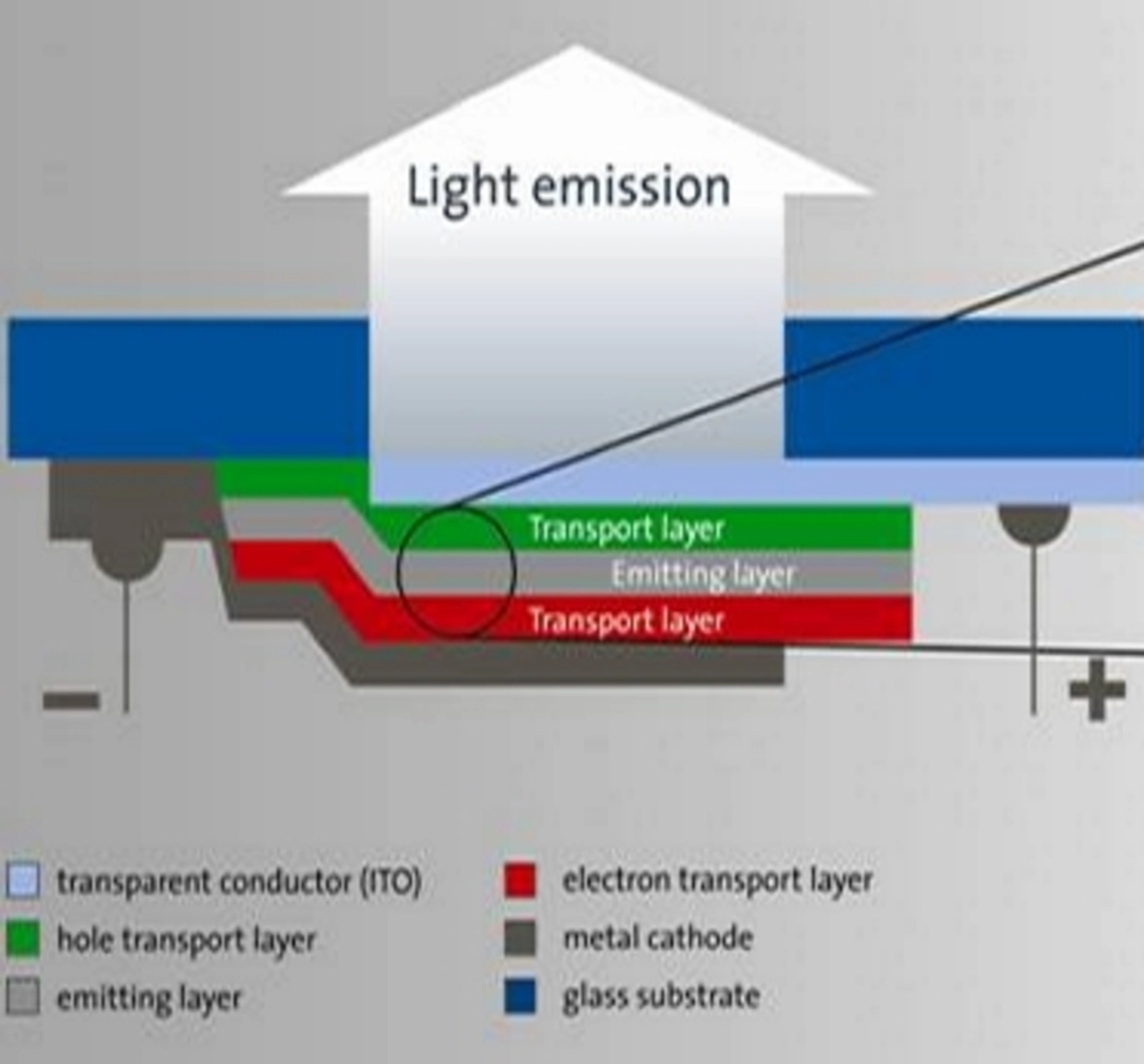 OLEDs bestehen aus etwa 100 Nanometer dünnen Schichten aus organischen Materialien (Kohlenstoffverbindungen), die auf ein Substrat (z.B. Glas, dünne Metallfolie) aufgebracht werdne. Zum Vergleich: Ein menschliches Haar ist etwa fünfzig Mal dicker als diese Lichtquelle. OLEDs sind bei entsprechender Strukturierung im Aus-Zustand unsichtbar und, je nach Trägersubstrat, auch transparent.