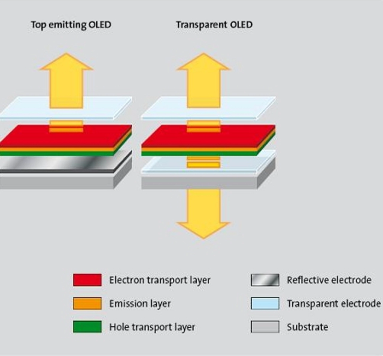 Nach unten abstrahlende OLEDs werden gegenwärtig auf Glassubstraten prozessiert. Das Licht wird direkt durch das Substrat abgestrahlt. Nach oben emittierende OLEDs sind auf reflektivem Substrat dargestellt, das könnten Metallfolien oder metallisch beschichtete Glassubstrate sein. Transparente OLEDs werden auf Glassubstraten hergestellt, sie sind bis 70 % lichtdurchlässig. Beim Einschalten wird das Licht in beide Richtungen, also durch Deckglas und Substrat, emittiert.
