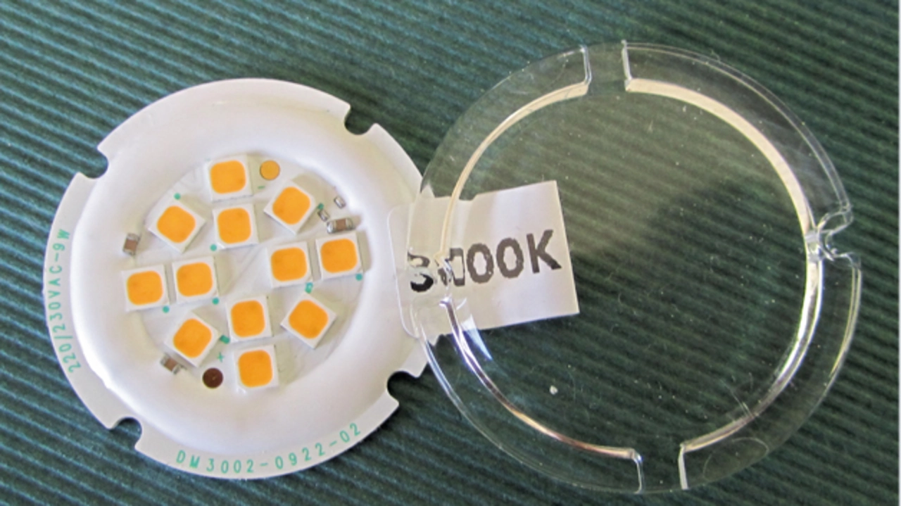 Da euroLighting fortlaufend seine treiberlose AC-Technologie verbessert, hat das Unternehmen nun die zweite Generation an D/COB-Modulen auf den Markt gebracht, die seit Mai 2015 auch in Serie geliefert wird. Eine wesentliche Neuerung bei diesen Modulen besteht darin, dass man den Chip nicht mehr nur auf die Leiterplatte lötet, sondern diese ungehäust als Dies direkt auf die Leiterplatte bondet. So lässt sich die gesamte Schaltung am Rande der Leiterplatte unterbringen. Um eine Berührungssicherheit herzustellen, wird die rundum geführte Schaltung mit Epoxidharz vergossen.