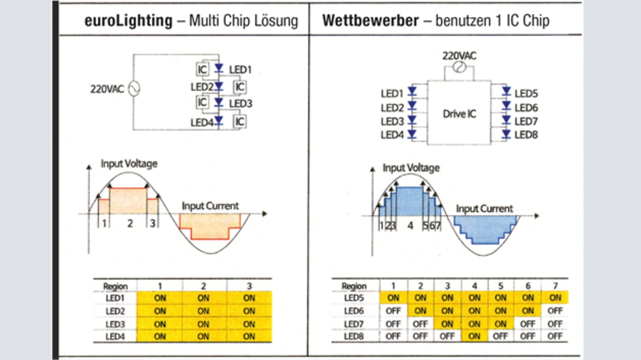 Vor einiger Zeit begann euroLighting nach einem Ersatz für die doch recht anfälligen Netzteile der LED-Module zu suchen. Fündig wurde man in Ostasien: Ein Hersteller dort hatte einen neuartigen Chip entwickelt, mit dem sich die konventionellen Stromversorgungen ersetzen lassen. Im Vergleich zu den bisher genutzten LED-Treibern sind diese wesentlich kleiner und günstiger, Anwender können damit Platz und Kosten einsparen. Zudem benötigen die AC-Module keine zusätzlichen Elektrolytkondensatoren oder andere Bauelemente mehr, die schon nach kurzer Zeit ausfallen können.