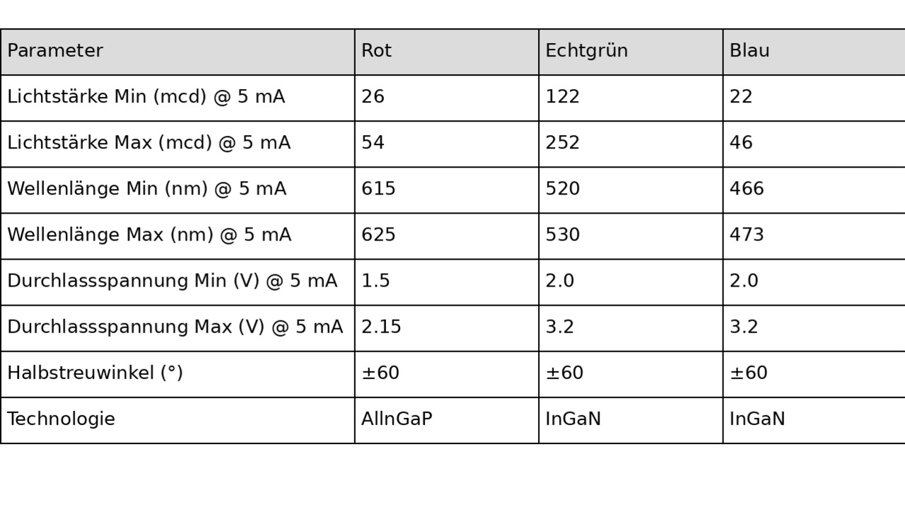Die Durchlassspannungen betragen 1,5 bis 2,15 V (Rot) sowie 2,0 bis 3,2 V für Grün und Blau. Der Halbstreuwinkel liegt bei ±60°.