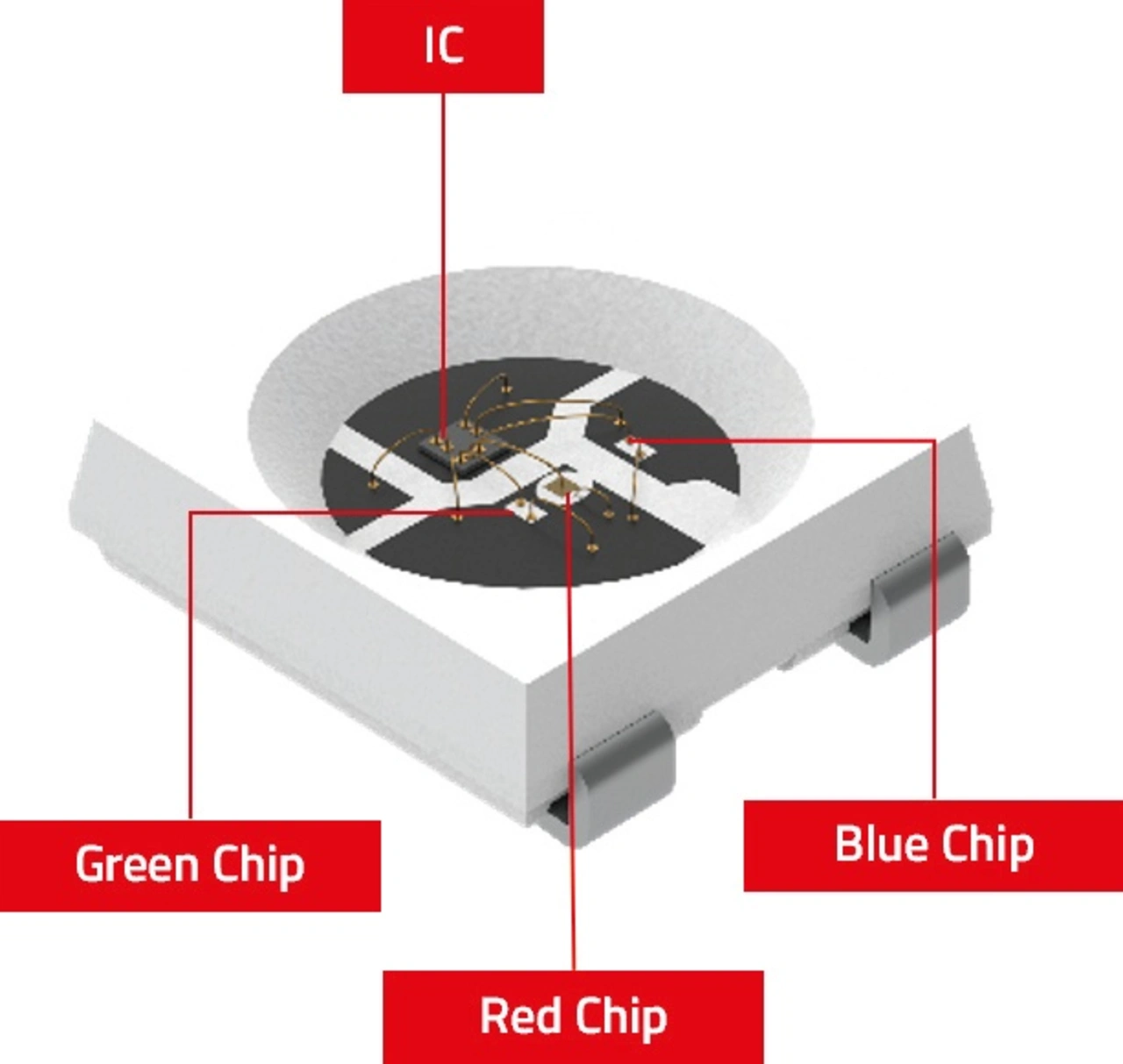 ICLEDs sind Halbleiterbauelemente, die mindestens eine lichtemittierende Diode (LED) mit einem integrierten Schaltkreis (IC) kombinieren (Bild 1). Die roten, grünen und blauen LED-Chips sind für die Lichtemission verantwortlich, während der integrierte Schaltkreis die betrieblichen Aspekte verwaltet, wie etwa das Dimmen der einzelnen LEDs, die Farbmischung und die Kommunikation zwischen der Steuereinheit (Mikrocontroller) und den benachbarten ICLEDs im Schaltkreis. Durch diese Kombination können ICLEDs komplexere Aufgaben erfüllen als Standard-LEDs und eignen sich daher für ein breiteres Spektrum von Anwendungen.