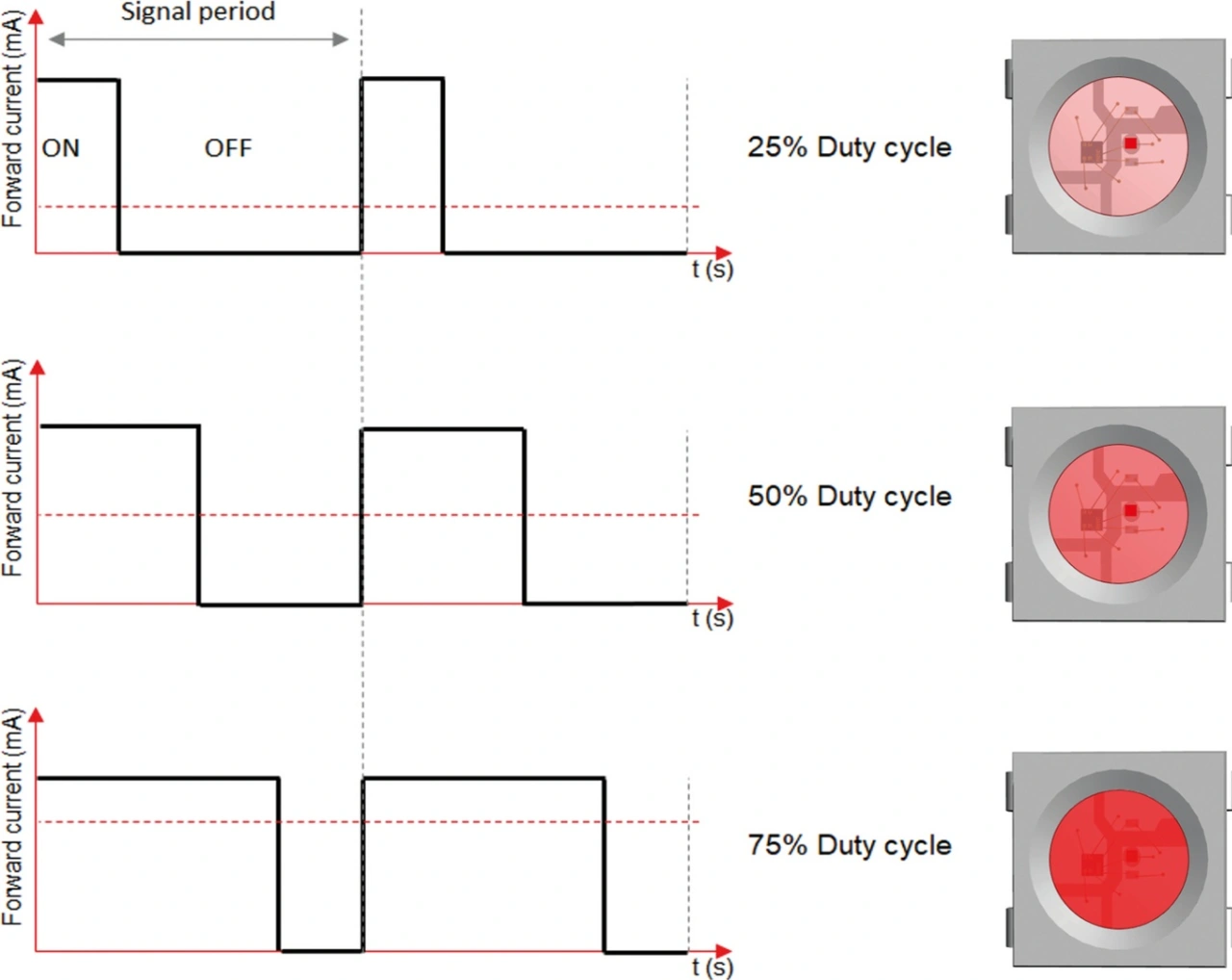 Gleichung 2 besagt, dass das Tastverhältnis gleich dem Verhältnis zwischen der Einschaltzeit und der Periode des Signals ist. Mit anderen Worten: Ein Treiber (z. B. MOSFET, bipolarer Transistor, Stromsensor, usw.) fungiert als »Schalter«, der die LED mit einer festen Frequenz ein- und ausschaltet [9,10]. Mit zunehmender Einschaltdauer wird sich auch die Lichtleistung der LED erhöhen. Bild 2 veranschaulicht die erwartete Auswirkung auf die Helligkeit einer IC-LED, wenn das Tastverhältnis des PWM-Signals für die rote LED auf 25 %, 50 % und 75 % geändert wird.