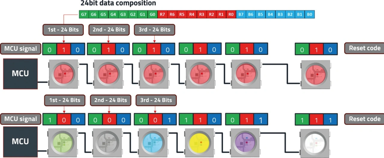Bild 3 zeigt das Funktionsprinzip von IC-LEDs. Der Einfachheit halber wird in diesem Beispiel das 8-Bit-Protokoll auf nur drei Bits reduziert, die jeweils für die Farben Grün, Rot und Blau stehen. In der ersten Schaltung gibt das vom Mikrocontroller gesendete Signal an, dass alle LEDs rot leuchten sollen. Die erste ICLED in der Reihe empfängt die gesamte Datenfolge, extrahiert ihre eigenen Informationen und sendet dann die restlichen Daten an die nächste LED in der Kette weiter (Daisy-Chain-Prinzip). Auch wenn keine weiteren Daten gesendet werden, behalten die ICLEDs ihren gewählten Zustand bei, bis sie ein Reset-Code-Signal erhalten, wie im Datenblatt angegeben, gefolgt von einem neuen Datenbefehl über den DIN-Pin.
