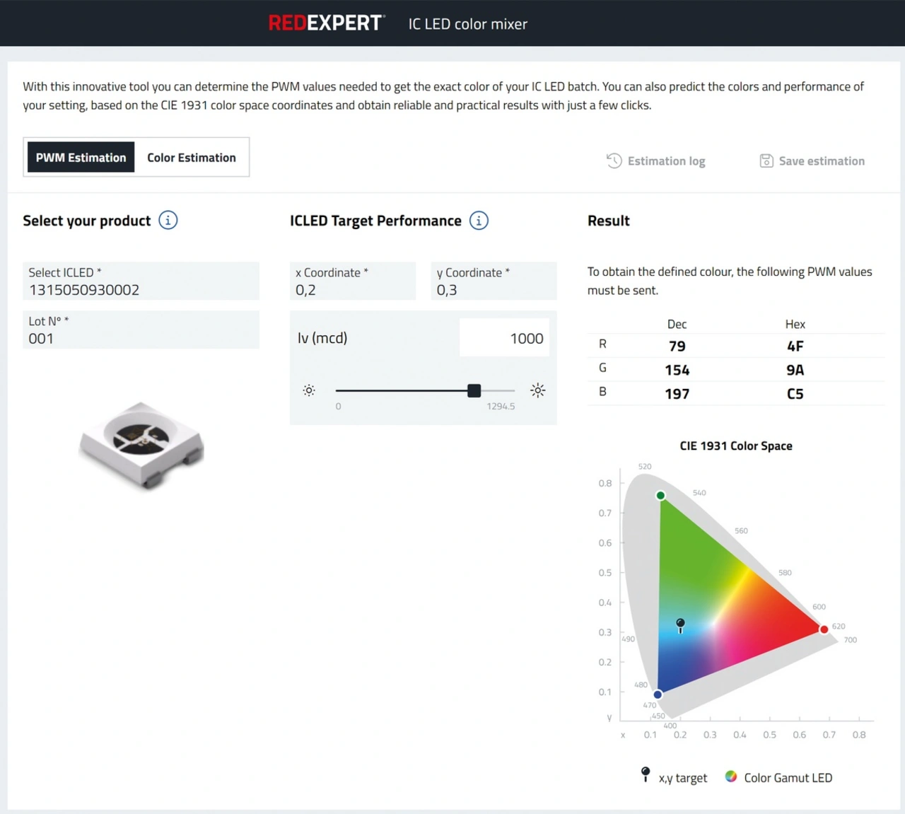 Auf der intuitiv bedienbaren Benutzeroberfläche des REDEXPERT ICLED Color Calculator (Bild 4) wählen Kunden den gewünschten ICLED-Typ sowie Farbe und Helligkeit im CIE1931-Normfarbsystem (»xy-Farbraum«). Das generiert automatisch den passenden digitalen Wert für die Pulsweitenmodulation der im ICLED-Bauelement verbauten RGB-LEDs, bezogen auf die Eigenschaften ihres Bins. Diese Werte können direkt in die Programmierung der ICLEDs übernommen werden.