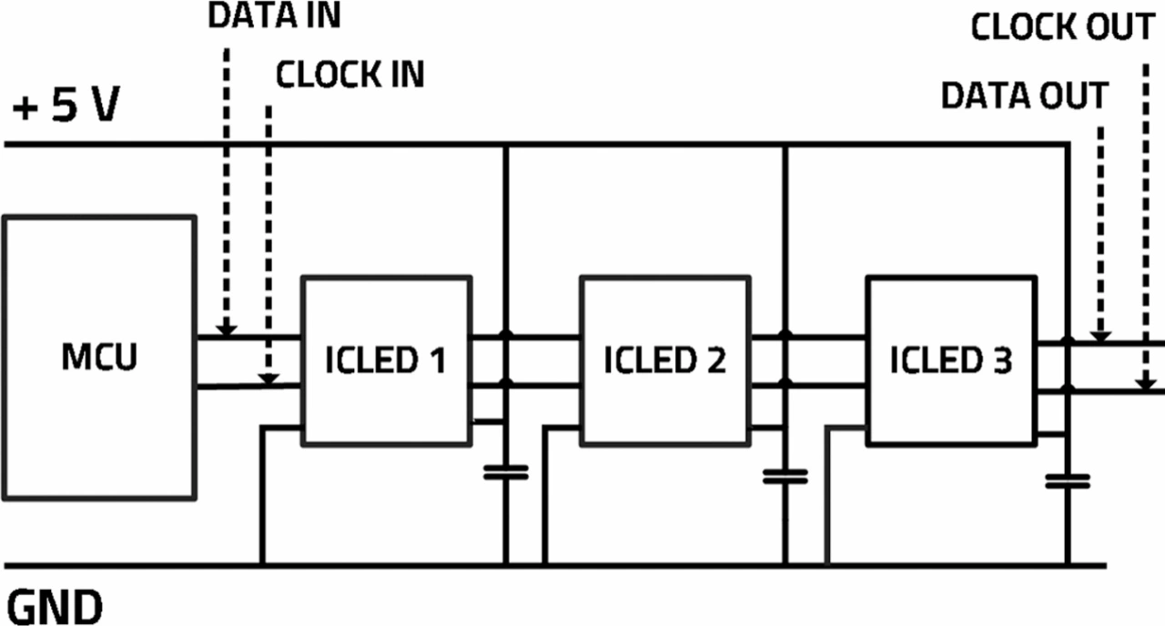 Viele IC-LEDs können über die SPI-Schnittstelle (Serial Peripheral Interface) der meisten gängigen Mikrocontroller (z. B. Arduino, Raspberry Pi und ESP32 [13]) angesteuert werden. Diese Boards bieten die nötigen Schnittstellen und die erforderliche Rechenleistung, um die Kommunikationsprotokolle zu verarbeiten und die LEDs anzusteuern. Was die Softwarebibliotheken betrifft, so gibt es zahlreiche Open-Source-Ressourcen im Internet, die die Erstellung komplexer Lichteffekte erleichtern, ohne dass Low-Level-Code geschrieben werden muss (ein Beispiel ist die FastLED-Bibliothek auf Github [13]).