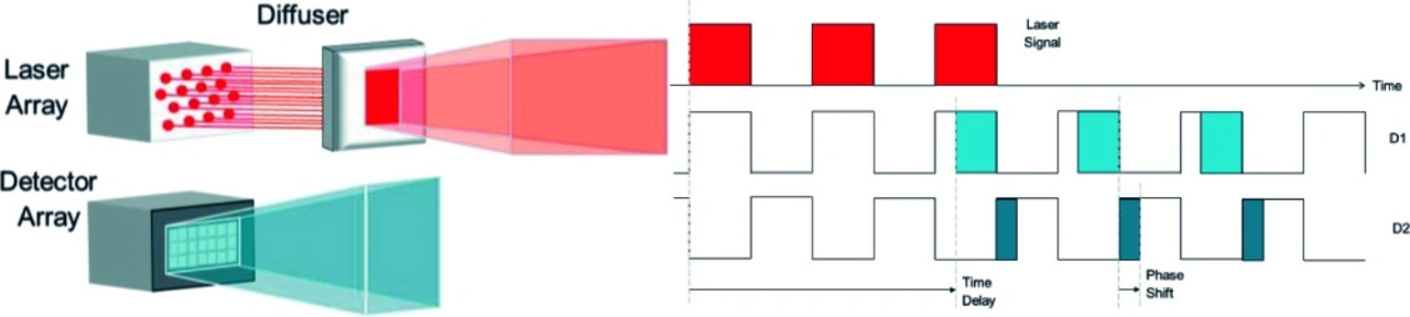 Der Indirect-Time-of-Flight- (iToF) Ansatz ist ähnlich, allerdings weist er einen wesentlichen Unterschied auf. Das Licht der Lichtquelle (i.d.R. ein IR-VCSEL) wird mithilfe eines Diffusors aufgeweitet und gepulst (50 % Duty Cycle) ins definierte Field of View emittiert. Im nachgelagerten System ist eine Art Standardsignal hinterlegt, das den Detektor innerhalb einer bestimmten Zeit auslöst, wenn das Licht auf kein Hindernis trifft. Unterbricht ein Objekt dieses Standardsignal, kann das System aufgrund der dadurch entstehenden Phasenverschiebung und der zeitlichen Verzögerung der Impulsfolge die Tiefeninformation pro definiertem Pixel des Detektors ermitteln.